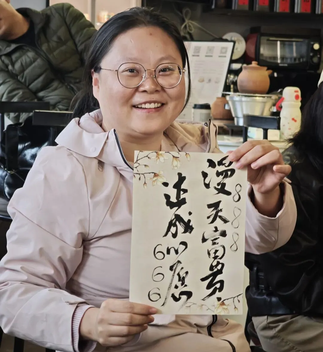 很快大家写好后互相交换现场朗读,有写祝福语句,有写唐诗宋词,大家在欢声笑语中读诗歌、谈感受,品香茶,褪去了平日的忙碌,在这里放松身心。现场一片温馨祥和的气氛,大家纷纷和自己的作品合影,留下这段难忘的时光。