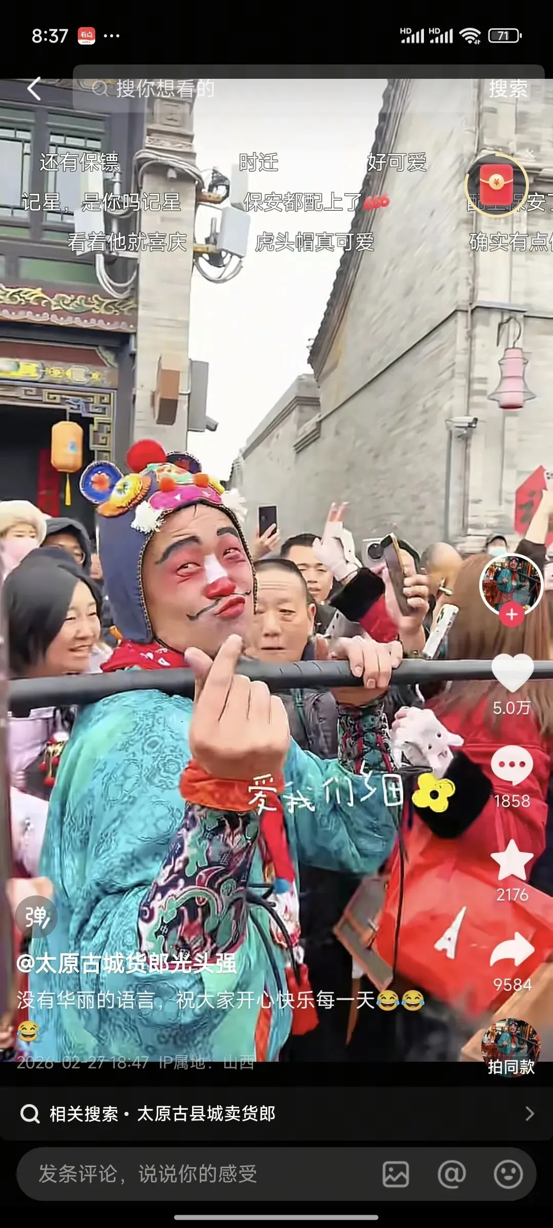 青砖黛瓦的太原古县城,今年春节被一个身影彻底点燃。头戴虎头帽、肩挑40斤货担的“卖货郎”杨翔,踩着明快的鼓点穿街走巷,身后追着欢笑的人群。这个被网友戏称为“行走的显眼包”的汉子,用最朴素的快乐,让这座千年古城在2026年的春天变得鲜活滚烫。