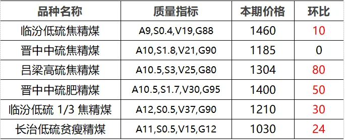 价格行情:产地炼焦煤市场行情以涨为主。省内主要煤企炼焦煤长协车板价格维持稳定;坑口销售及线上竞价市场成交氛围良好,多煤种价格普遍上涨,临汾、吕梁、晋中、长治地区主焦煤及配焦煤市场价格上涨10-80元/吨不等。