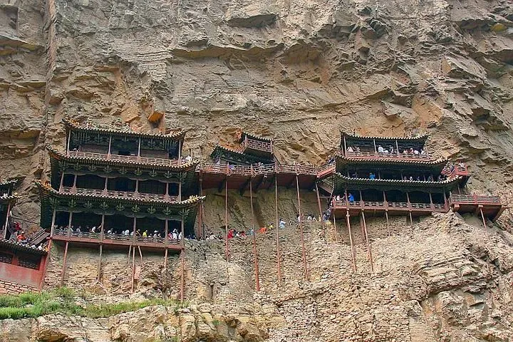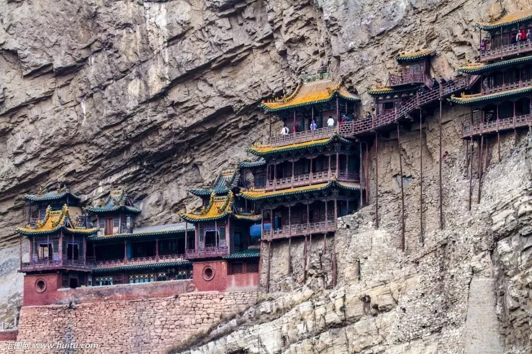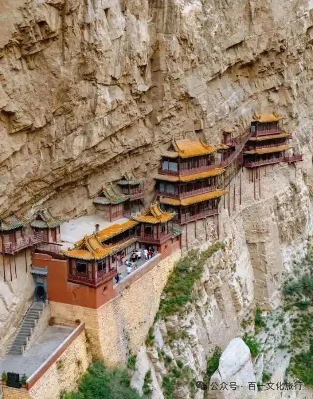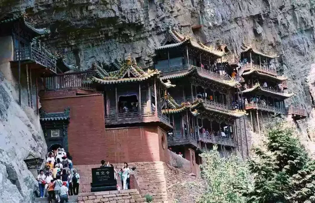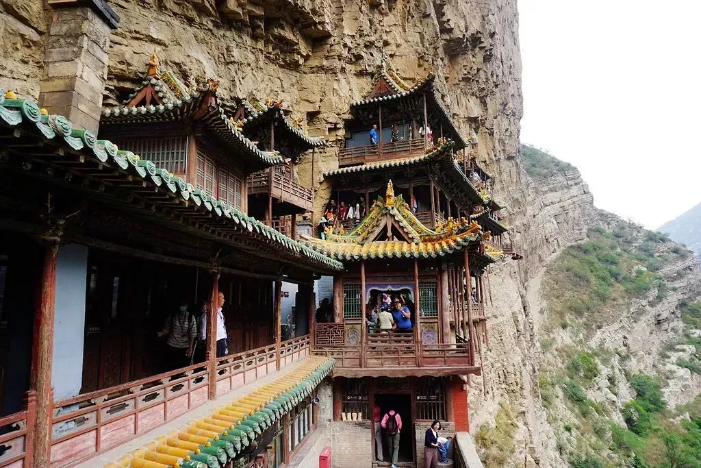 悬空寺(只进行外观,不进行登临感谢配合):全寺为木质框架式结构,最值得惊叹的是它依靠榫接结构,距今已有1500多年历史,嵌入崖内而不倒。诗仙李白观后醉书壮观,徐霞客赞为天下巨观。