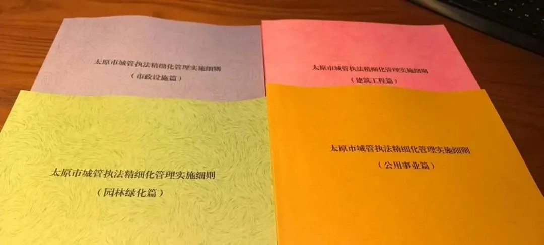 为统一全市城管执法标准,执法部门组建工作专班,编制《太原市城管执法精细化管理实施细则》。细则共计50余万字,涵盖建筑工程、市容环境、市政设施、园林绿化、公用事业、房产管理六大篇章,从执法依据、执法流程、执法巡查、执法标准等多个维度,进行全面统一与细化规范,为提升城管执法精细化管理水平提供了指导遵循。
