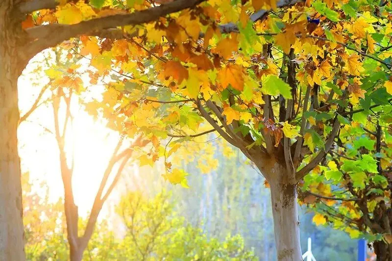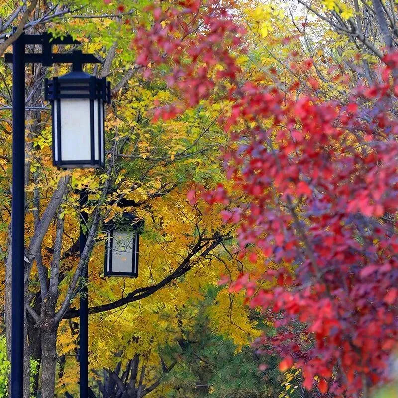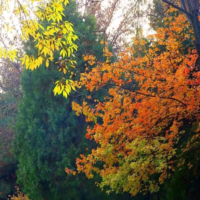 当季节的轮盘转入深秋,这里的每一寸土地,仿佛都被太上老君不慎打翻的八卦炉丹染过。不再是单一的灿金或赤红,而是一场色彩的盛大交响——银杏的黄,明亮而耀眼,像是洒了一地的阳光;枫树的红,炽烈而温暖,仿佛在枝头点燃了团团火焰;常青松柏的绿,沉稳而坚毅,默默做着所有绚烂的背景板;还有那过渡色的橙与褐,交织其中,调和出独属于秋的温柔与静谧。