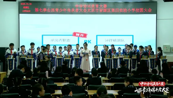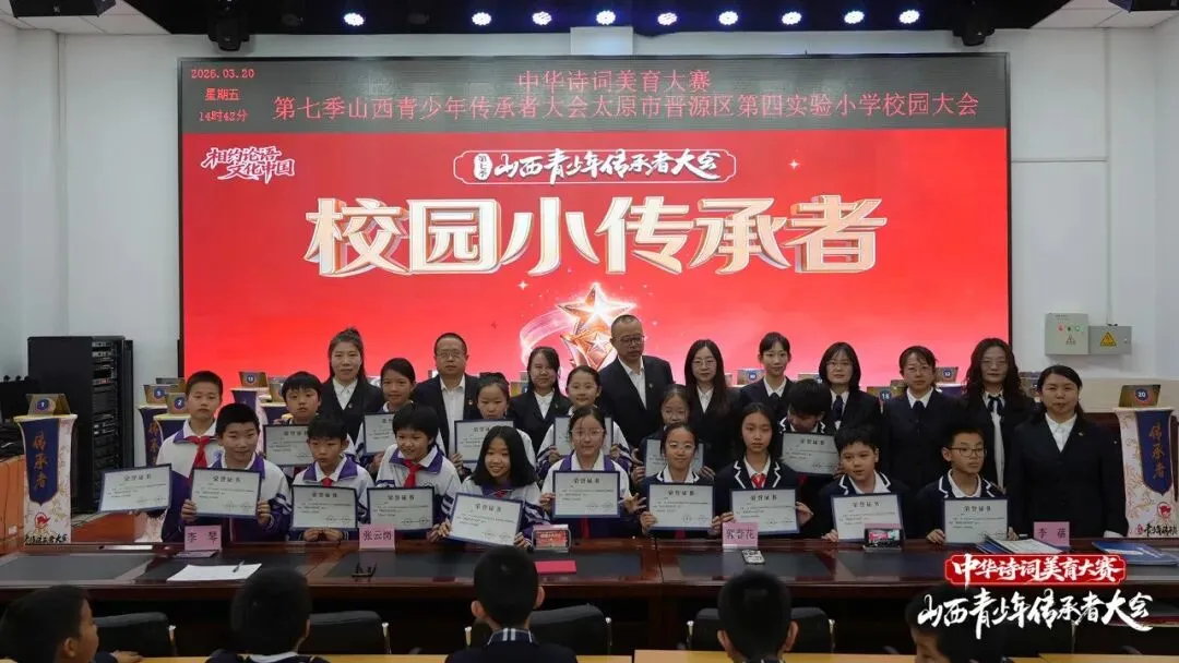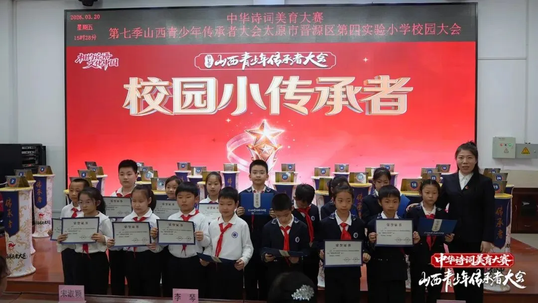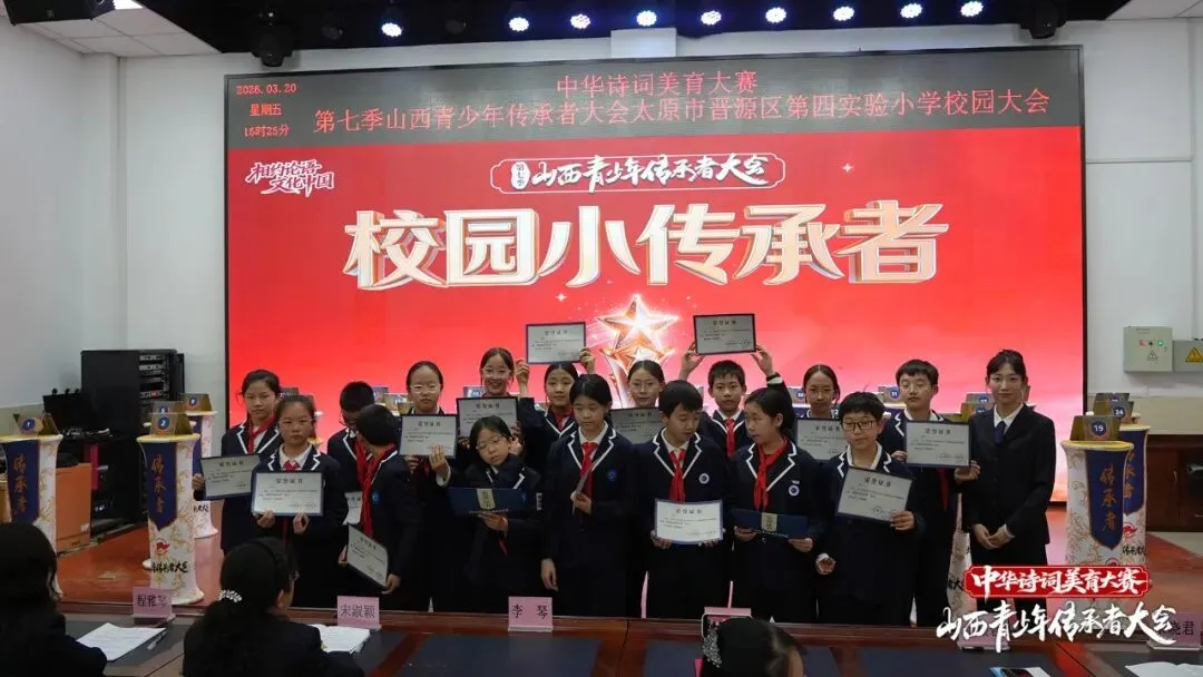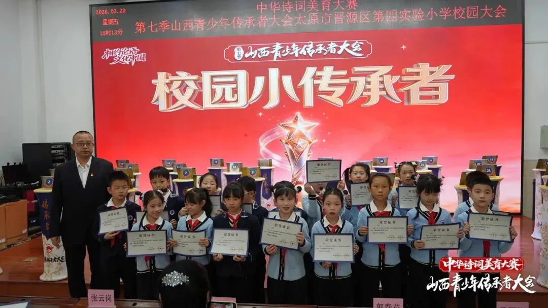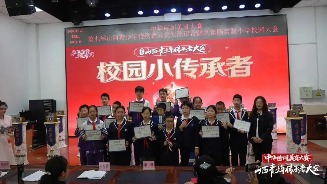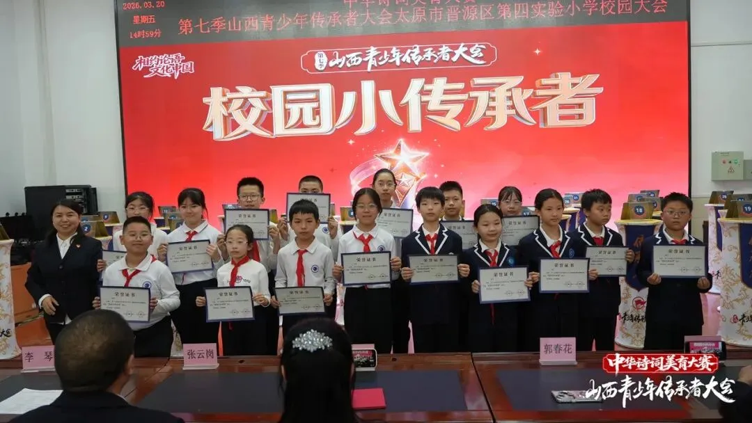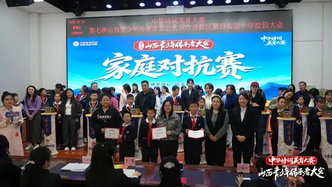 2026年3月20日一场穿越千年的文化邂逅,在晋源区第四实验小学焕发光彩。本次活动既是中华经典文化的深度浸润,也是新时代少年风采的精彩亮相,让同学们在忙碌的学习生活中,与古韵相逢、与经典同行,真切感受中华文化的厚重底蕴与独特魅力。活动伊始,太原市晋源区第四实验小学党支部书记、校长李建英发表讲话。出席本次活动的校领导还有晋源区第四实验小学党支部副书记、政教主任郭春花,副校长张云岗,副校长王俊芳以及各部门负责人。四小的同学们为大家带来精彩的开场节目——诵读《诗词里的中国》,在抑扬顿挫、富有音律节奏的诵读中,紧张激烈的班班对抗赛精彩上演。“赞誉声声传暖意,云端共赏韵悠长”。在学校周密部署、悉心筹备下,在家长们全程陪伴、鼎力支持中,活动全程氛围热烈、好评不断。直播间内,个人点赞数以百计、千计,互动数据节节攀升,热度持续高涨。本次活动特别设置家庭互动环节,家长们与小选手一同参与答题、同台互动,不仅增进了对孩子的了解、增长了文化知识,更在同心作答中传递爱与陪伴,让书香浸润家风。许多家长全程在线,与现场小选手线上同步答题、积极互动,在评论区踊跃分享感悟与心声。家长们纷纷表示,本次活动意义深远、形式新颖,既为孩子们搭建了展示自我的舞台,也让中华优秀传统文化真正走进校园、浸润童心。家长们字里行间,满是对本次活动的高度认可、对学校育人理念的由衷赞许,以及对辛勤付出的老师们真挚的感谢。舞台之上,同学们意气风发、自信昂扬,在知识比拼与风采展示中尽展才情;评委老师们公平公正、专业独到,在点评中传递文化内涵,在指导中助力学子成长。台下气氛热烈,云端同步喝彩,多位实力选手脱颖而出、优秀团队斩获佳绩,生动展现了晋源区第四实验小学扎实的文化教育成果与学子们出众的综合素养。范淑娇老师作为本次校园大会的读题老师,全程给在场同学及直播间的家长朋友们诵读题目。整场活动紧张有序、雅致鲜活,同学们在比拼中提升自我,在场观众在观赏中浸润心灵。本次活动直播吸引千人师生及家长在线观看、1.1万次点赞、134次转发分享,一组组亮眼的数据,既是对校园文化育人工作的充分肯定,更是对全体教师用心耕耘、默默坚守的最好回馈,也见证着中华优秀传统文化在校园生生不息、薪火相传。当今家校协同的重要性愈发凸显,它是连接学校与家庭教育的桥梁,能助力孩子们的成长。为进一步让家校紧密相连,形成教育合力,本次校园大会增加了一场家庭赛。32组家庭火力全开,家长凭经验为孩子引导,孩子用所学知识积极答题,两人分工明确且共同努力,力争“优秀传承者之家”的荣誉称号。一番角逐后,四年级二班的武振东家庭、二班的王小木家庭、一班的田康圻家庭分别获得家庭对抗赛的冠亚季军。王校长为获奖家庭颁发荣誉证书。经过八轮班班对抗,共有128名同学胜出,获得“校园小传承者”荣誉证书,李校长和学校领导为他们颁发证书,三年级三班、四年级一班、五年级三班和六年级二班凭着班级选手的优秀表现,荣获本年级优胜班级荣誉。