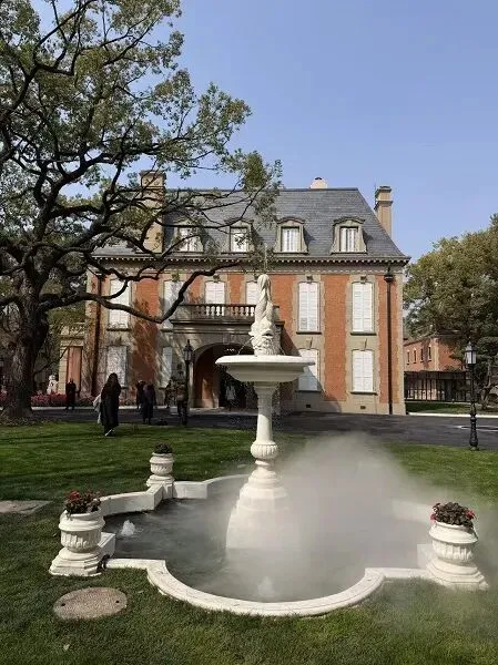 走出建筑,庭院间的法式景观同样令人沉醉。不同于极端对称的法国宫廷式花园,这里以缓和的轴线与围合设计,让修剪整齐的草坪、蜿蜒的石板路、欧式喷泉与四季花卉相映成趣。设计团队通过障景因借、旷奥相间的手法,悉心守护院内的古树名木与草坪绿化,让建筑与自然和谐共生。