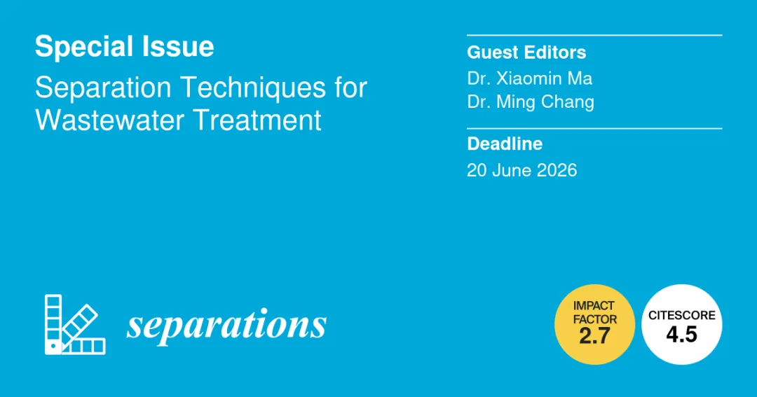 基于此,Separations 邀请了太原理工大学马晓敏教授、常明博士,合作创建特刊“Separation Techniques for Wastewater Treatment (废水处理中的分离技术)”。特刊旨在为全球研究者提供平台,分享水/废水处理领域分离技术的基础理论、技术创新及工业应用的最新进展。诚挚欢迎以下方向的高质量原创研究、综述、案例研究及简报类稿件:新型分离技术;选择性污染物去除的创新膜分离技术;先进吸附材料与工艺;耦合分离工艺;高盐度废水处理的新兴技术;传统分离工艺的先进优化;混凝-浮选/沉淀工艺的环保型改性;复杂废水处理的复合系统;可持续智能分离系统;分离过程中的资源回收;基于人工智能的分离过程监测与优化;生物基分离材料的开发与应用。