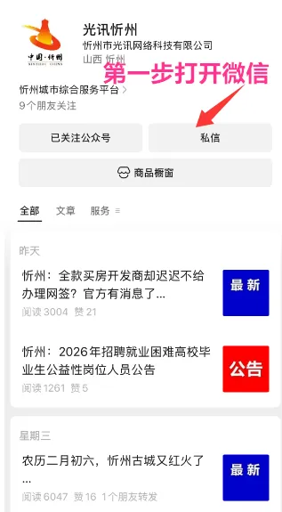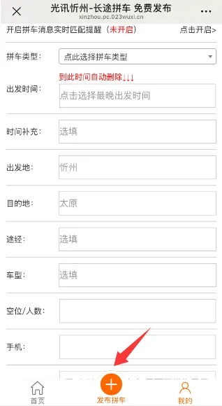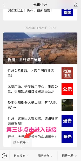 点击进入光讯忻州微信公众号,点击发消息,找到底部菜单栏“拼车发布”,点击进入。