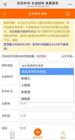 进入拼车平台后,点击下方“发布拼车”按钮,,选择拼车类型、出发时间等信息