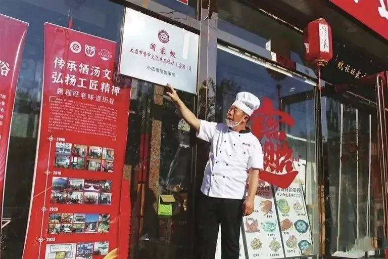 当时的太原地区属于唐国(后改称晋国),当地有在夏季举行祭祀的习俗。祭祀用的全羊,在仪式结束后会分给参与祭祀的民众。人们发现,这种用整羊熬制的汤,不仅味道鲜美,而且喝了之后神清气爽。到了宋代,牺汤从祭祀场所走向了市井。小店地处太原南郊,是连接晋南与太原城的交通要道。过往的商贩、脚夫在炎热的夏天走累了,就会在小店的街边喝一碗牺汤,既能解暑又能补充体力。明清时期,小店牺汤进入鼎盛期。当时的小店镇有数十家牺汤馆,每逢农历六月,家家户户都要喝牺汤。甚至有“六月牺汤香满城,不喝牺汤不算夏”的说法。2023年,小店牺汤被列入国家级非物质文化遗产代表性项目名录,成为太原市唯一入选的饮食类非遗项目。