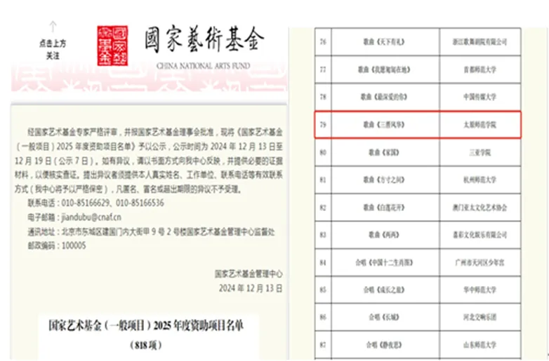 我校倾力打造的原创大型情景交响合唱作品《太行大合唱》,在创作过程中遵循了“三进入、三培养、三服务”的理念。其中的代表作《三晋风华》获小型剧目和作品创作项目批立项。与此同时,《太行大合唱》也于获批山西省艺术基金2024年度优秀剧目交流传播推广资助项目。此次两部作品的获批,不仅是对其艺术价值的肯定,也是其文化影响力在国家级和省级层面的高度认可,标志着我校艺术创作的实力和影响力得到了显著提升。