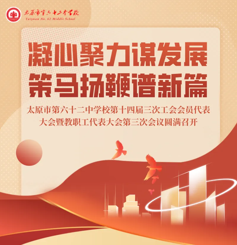 此次双代会的圆满召开,既是一次民主团结的盛会,更是一次凝心聚力、催人奋进的动员大会。未来,太原市第六十二中学校全体教职工将同心同德、同向而行,坚守育人初心,勇担教育使命,向着更美好的新征程阔步迈进,共同书写学校高质量发展的崭新篇章!
