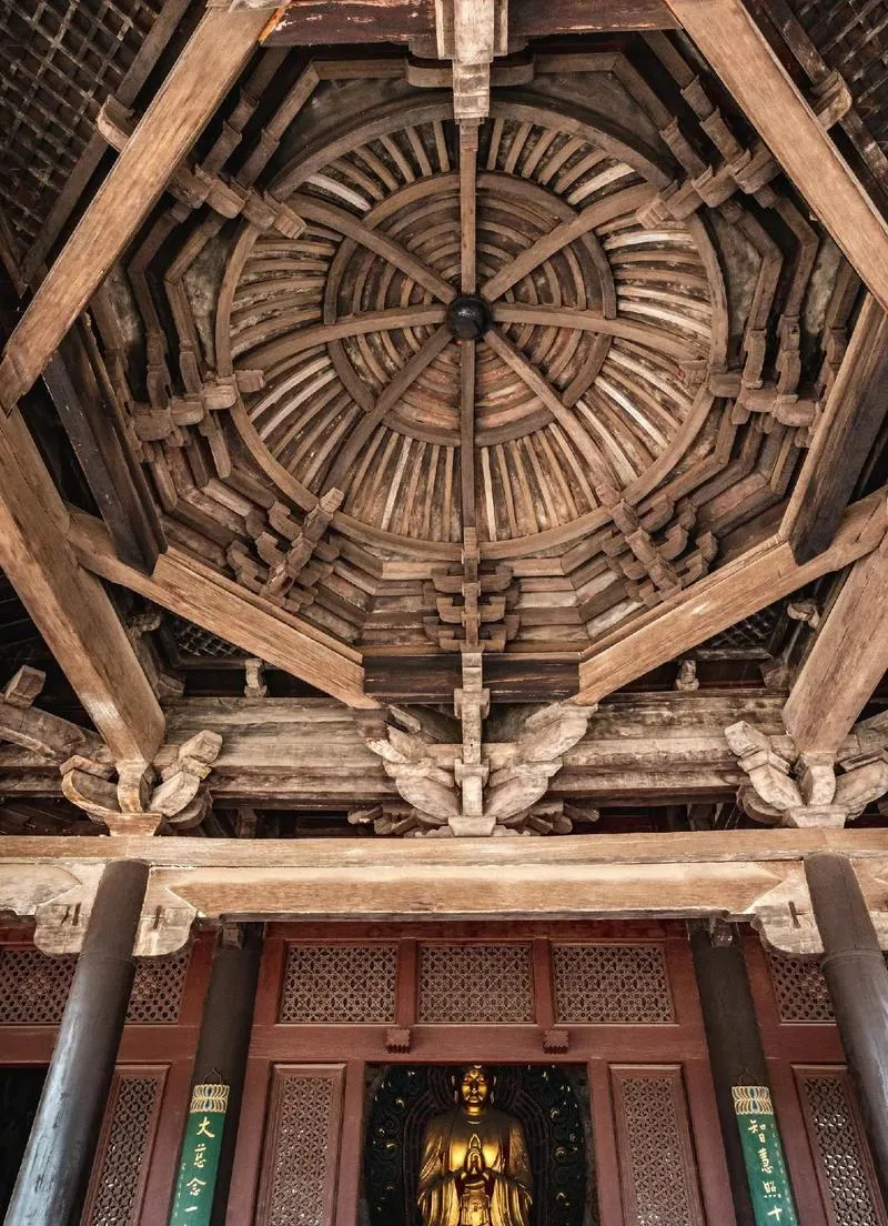 进门那一刻你就能感觉到,这个寺庙的气场和别的地方不一样,不是那种香火旺盛的热闹劲儿,是一种沉得住气的稳,大雄宝殿站在那,五间九脊,单檐庑殿顶,光看屋檐那个弧度就知道是辽代的东西,那种弧度现在的工匠做不出来,不是技术做不出来,是那股气做不出来,因为古人盖这个殿的时候,脑子里想的不是好看,是要让人站在这个殿前的时候,自己就变小了。