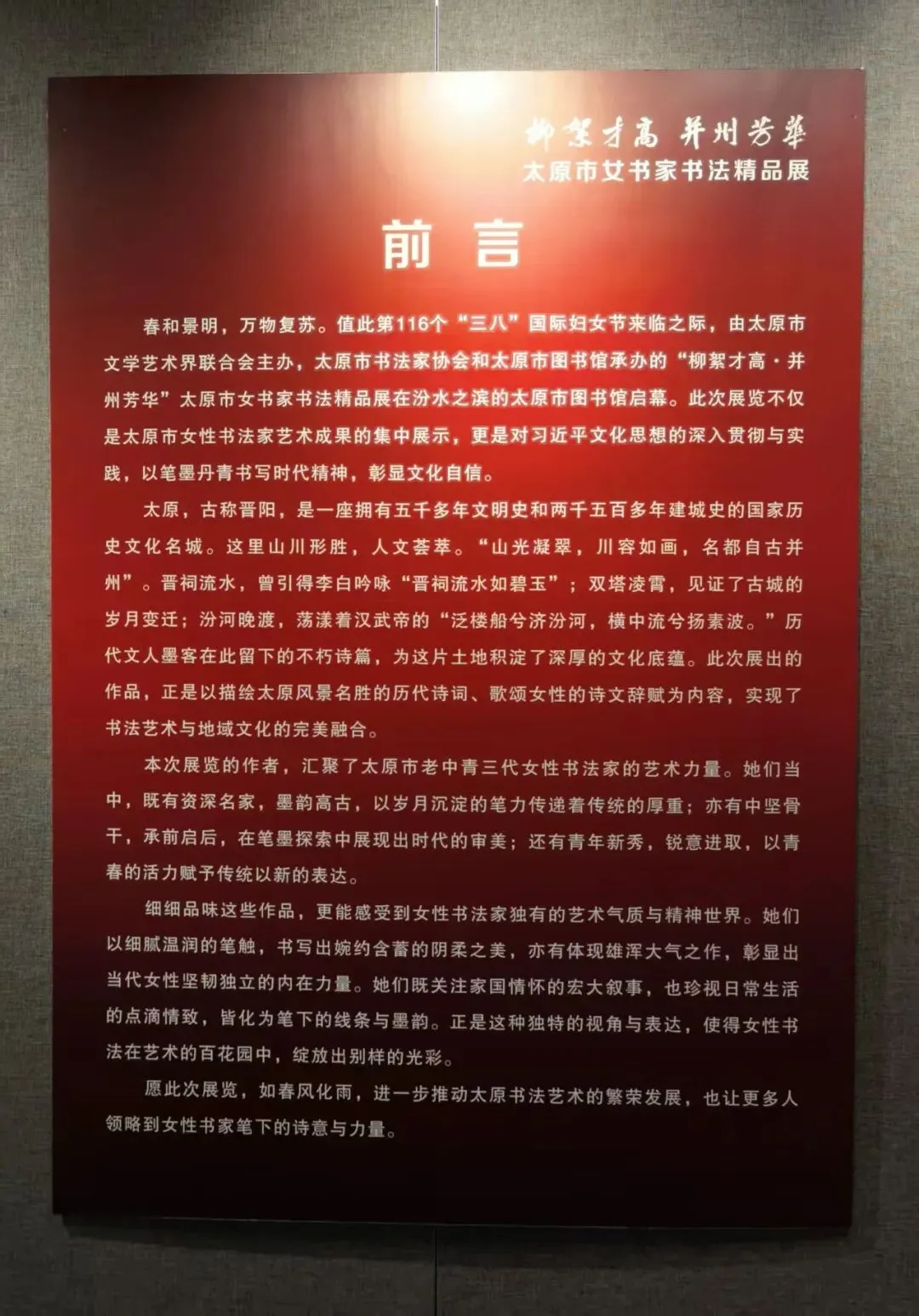 春和景明,汾水含章。昨日午后,我与弟弟匆匆赶至太原市图书馆一楼展厅,恰逢“柳絮才高 并州芳华”太原市女书家书法精品展撤展前夕。展厅里工作人员正准备收卷,红墙墨香尚未散尽,我们抓紧这最后时光,在笔墨芳华里赴了一场迟来却尽兴的艺术之约。