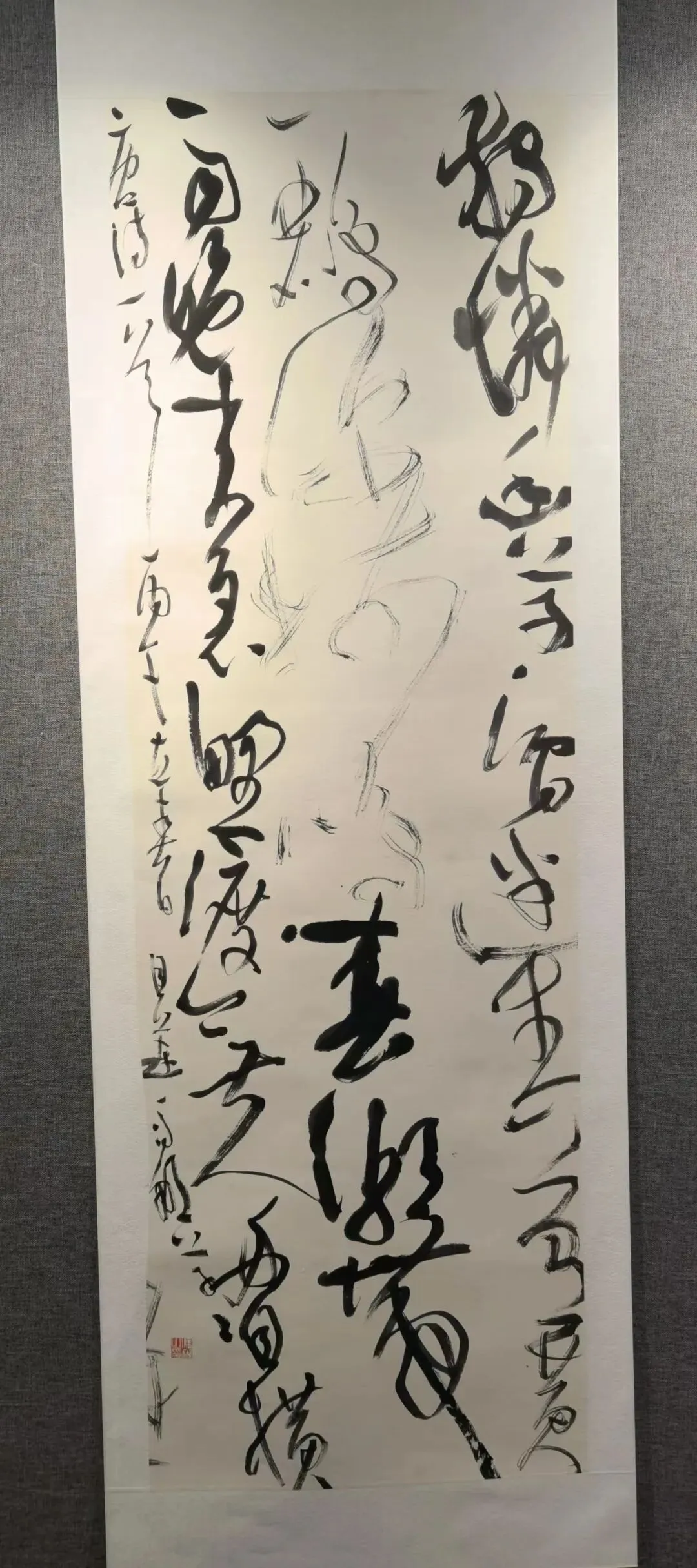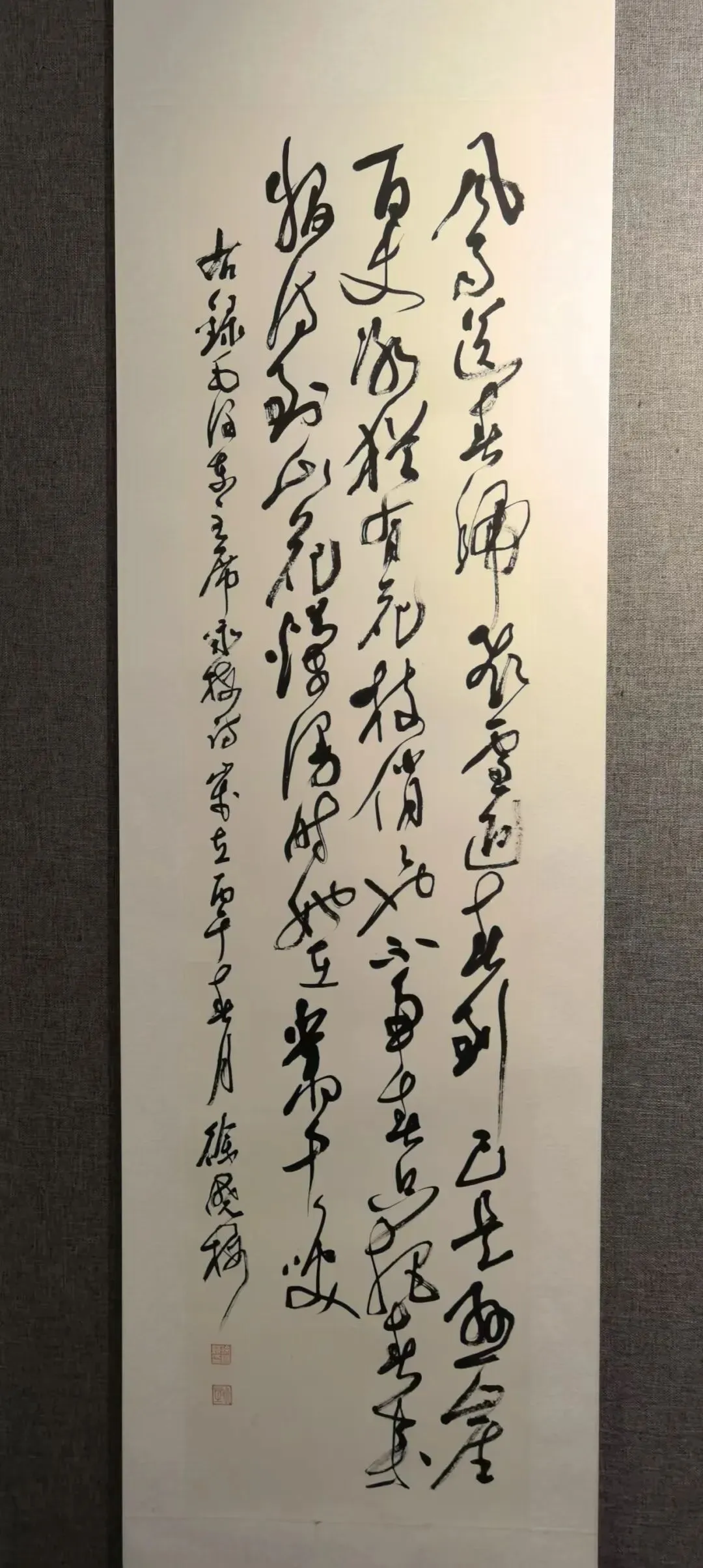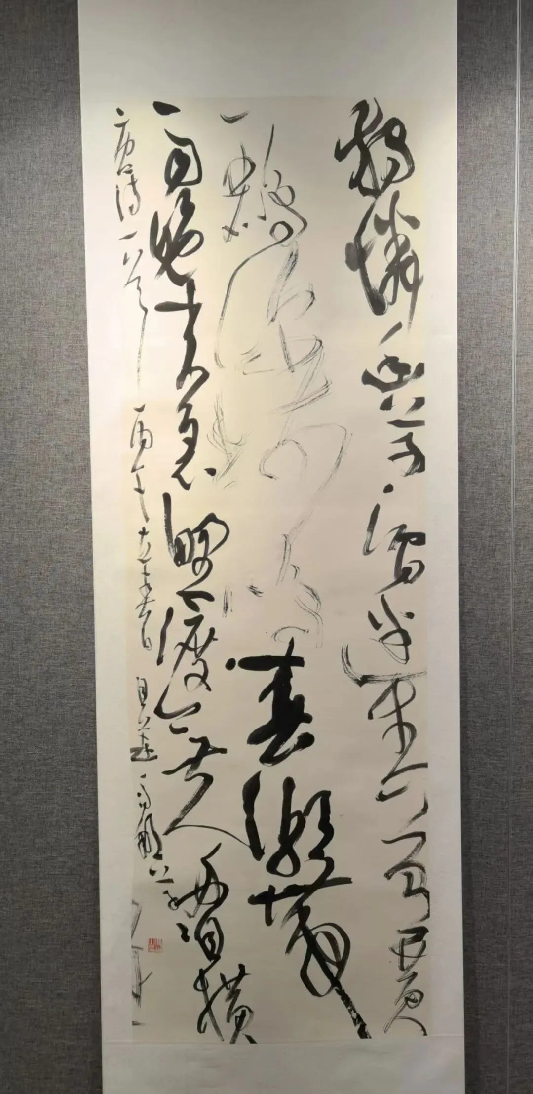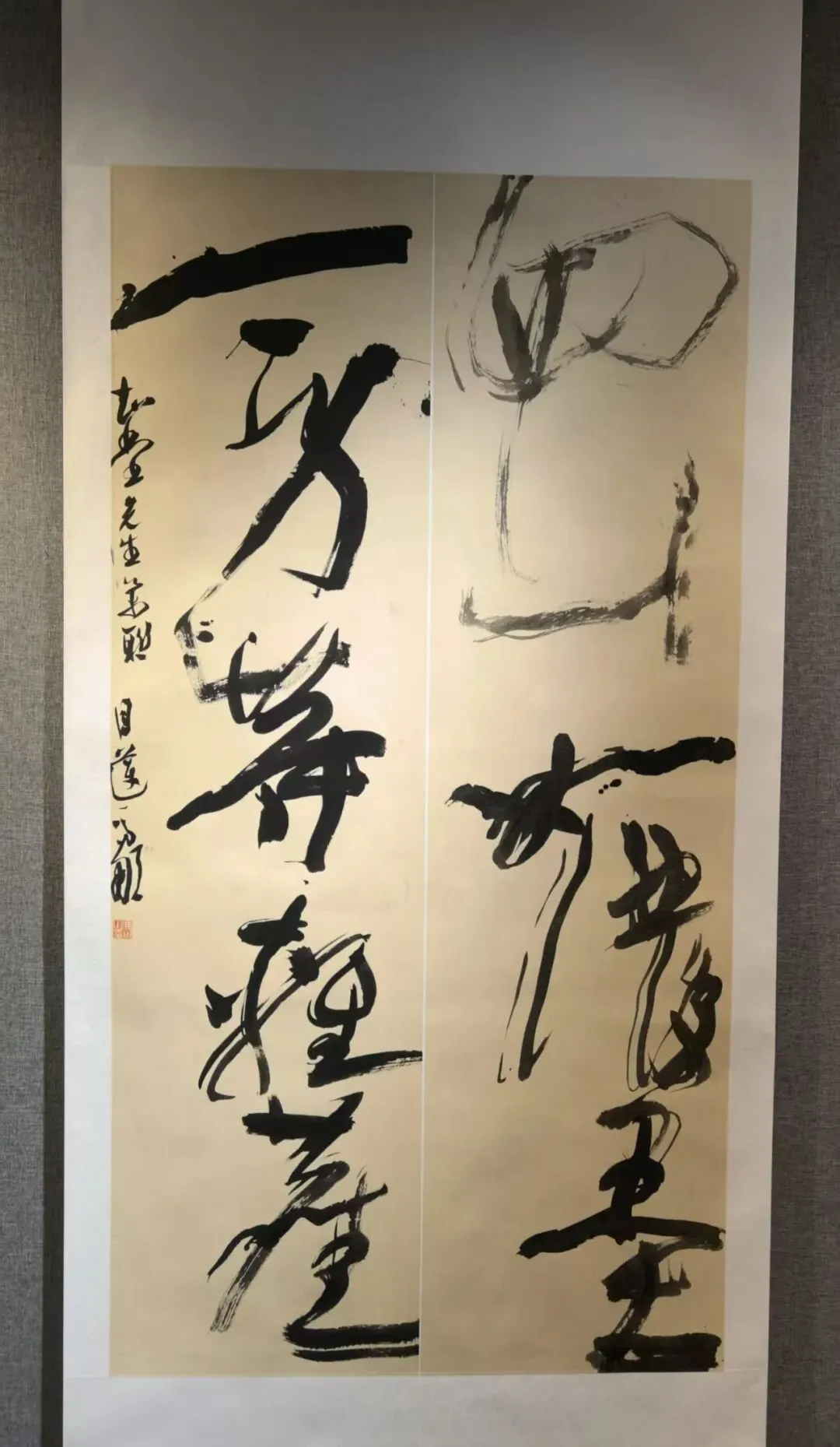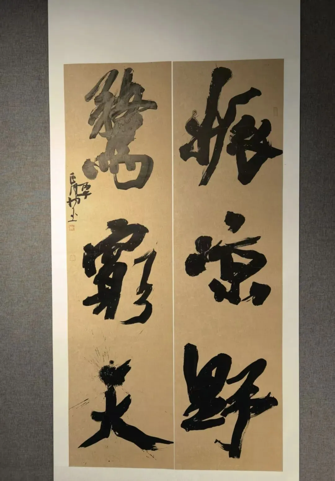 而本次观展最惊喜的邂逅,当属青年才俊冯娜老师。她是展览中最年轻的书家,按年龄排序位列最后,但其草书造诣却惊艳全场。冯娜老师毕业于太原师范学院书法专业,如今已是中国书法家协会会员、山西省书法家协会理事,其作品多次入展国展,五幅草书作品面貌各异,尽显才情。两幅作品静气内敛、沉稳含蓄,如清泉入涧;两幅她自谦略带火气,尤其是那幅双笔书写的对联,笔势奔放,虽有燥气,却尽显青春锐气。她的草书骨力劲健、气象开阔,若不看署名,几乎无人会相信出自一位年轻女书家之手,我由衷赞叹,她无愧为太原师范学院书法专业的骄傲,更是当代山西书坛极具潜力的青年翘楚。我们就草书的笔法、章法与创作心境深入交流,她毫无保留地分享创作体会,谦逊又专业,让我受益匪浅。