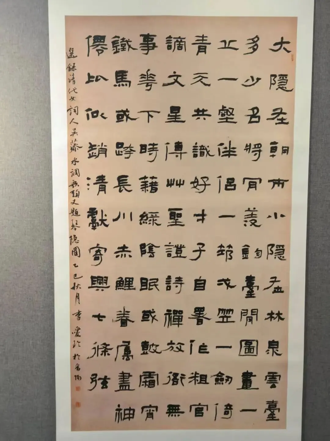 顺着展墙按年龄依次观览,每位书家的五幅作品各有千秋。多次入选国展的李爱玲老师、陈冰老师的隶书,端庄古朴,笔力沉雄,汉隶的厚重与典雅跃然纸上;文水籍女书家刘俊彦老师的行书,笔墨清雅,格调不俗,字里行间满是晋地文人的温润与通透,让人忍不住驻足细品。行至展厅中段,意外邂逅了同样深耕隶书的彭秀珍老师,交谈之下才知,她是文水籍工笔画名家石玉玺先生的学生,一见如故,还问起石老师的近况。我们互加微信,就隶书的笔法、结字与创作心得倾心交流,格外亲切。