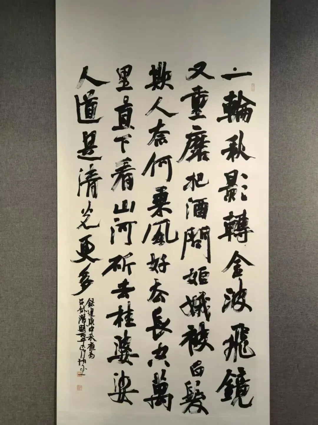 随后遇见的周纳玉老师,更让我眼前一亮。她的五幅行书与行草作品,笔力刚健,气韵生动。经请教方知,其书法取法米芾的灵动跳宕、颜真卿的雄浑厚重,兼融何绍基的拙朴苍劲,师古而不泥古,自成一家风貌。最令人赞叹的是她精湛的墨法:涨墨自然天成,浓淡干湿层次分明,就连宿墨都是亲手调配,笔墨在宣纸上晕染出的意境,既有金石气,又有书卷气,让人深深折服。