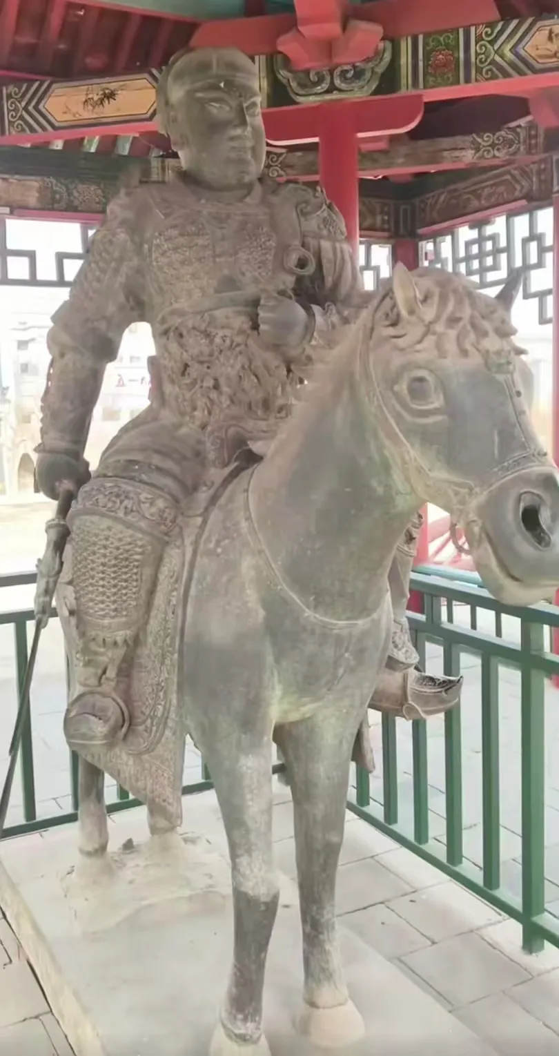 假山顶上有关公亭,亭内有一明代所铸造的青铜关公持刀骑马像。