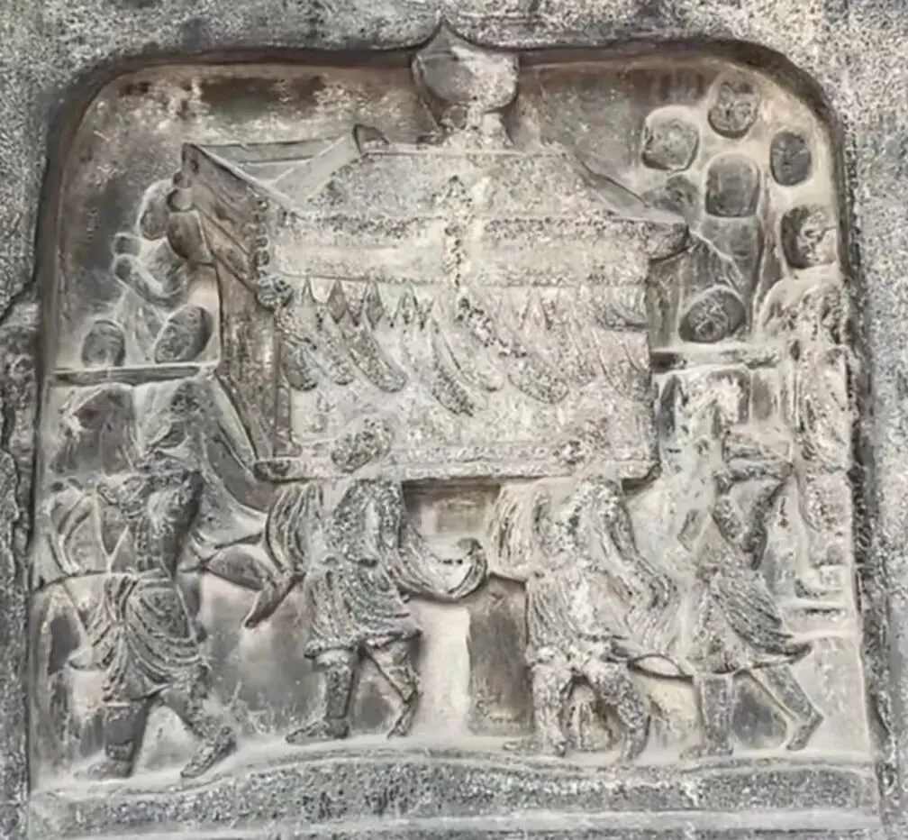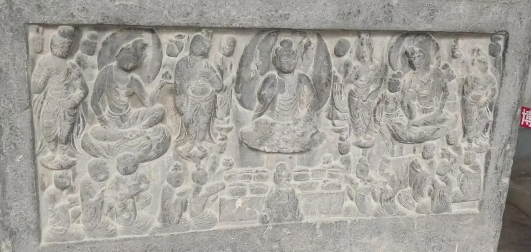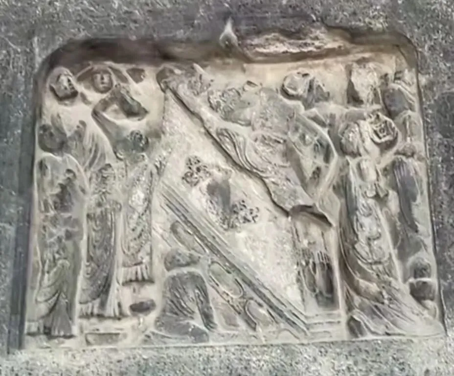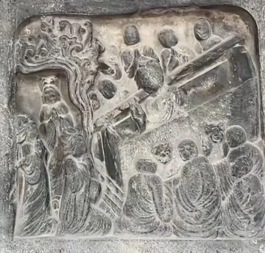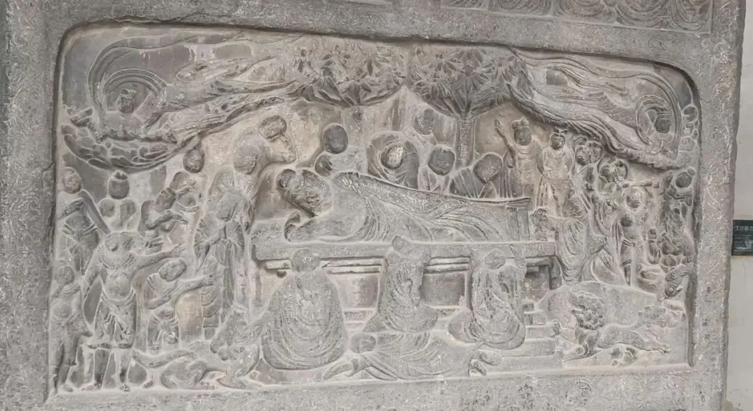 佛陀在娑罗双树之间,右侧卧躺,安静涅槃。菩萨、弟子、飞天都围在旁边悲痛哀悼,这是整幅碑刻最中心的画面。
