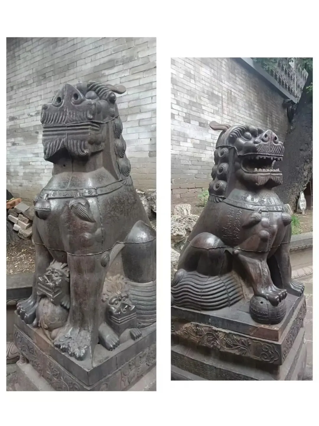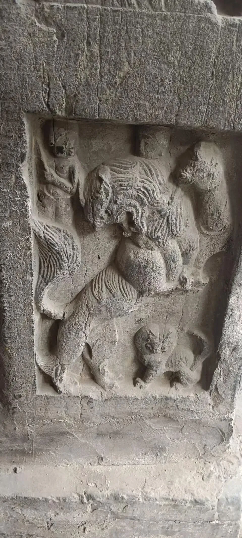护法狮子,呈跃起状态,造型饱满,气势雄浑。鬃毛细密,身躯健壮,尾巴上翘,极具动感。右下方还有一只小狮子。