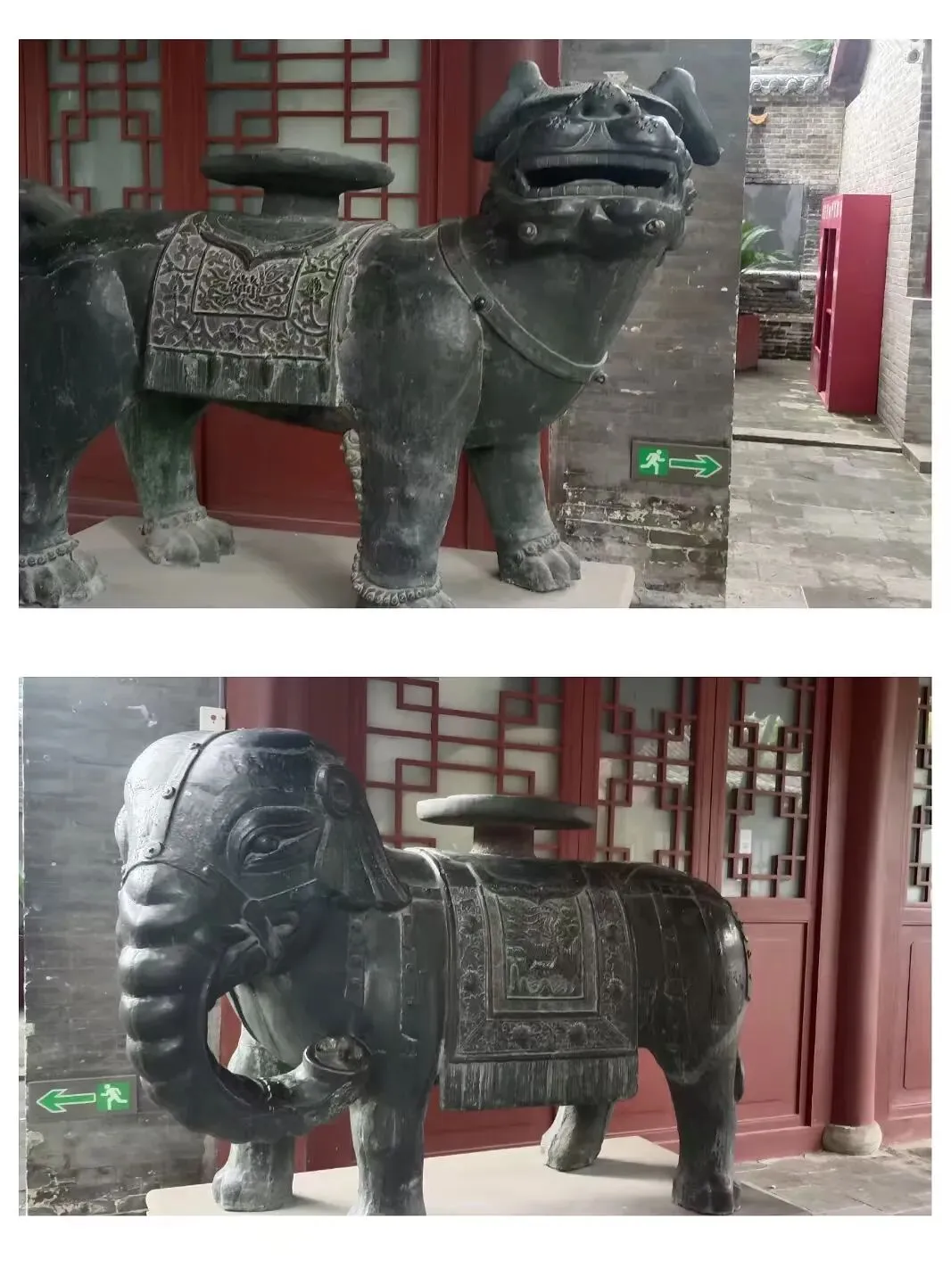 二进院落的献殿内,正中是大肚弥勒佛塑像,两边分别是青铜狮子和大象,是文殊菩萨和普贤菩萨的坐骑。
