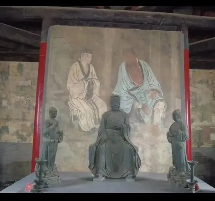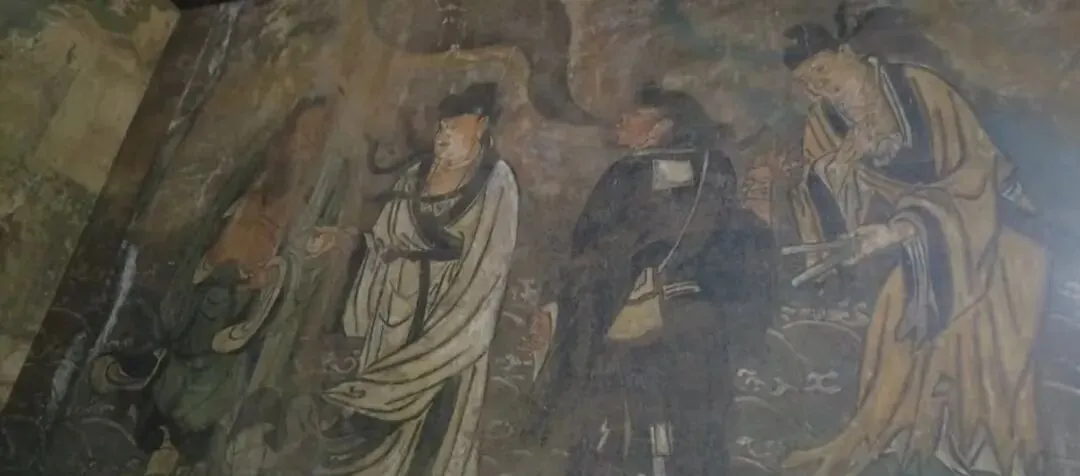 后面的背景壁画是钟吕论道图,左边白衣服的就是吕洞宾,右边袒胸露腹的是他的师傅钟离权。