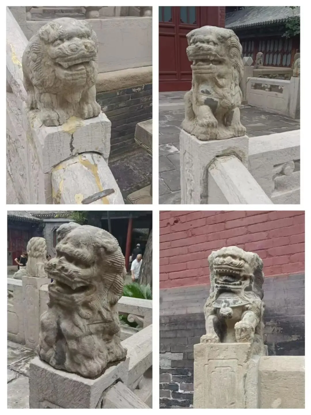 纯阳殿前面月台上有汉白玉栏杆,望柱上的狮子形态各异,张口露齿。