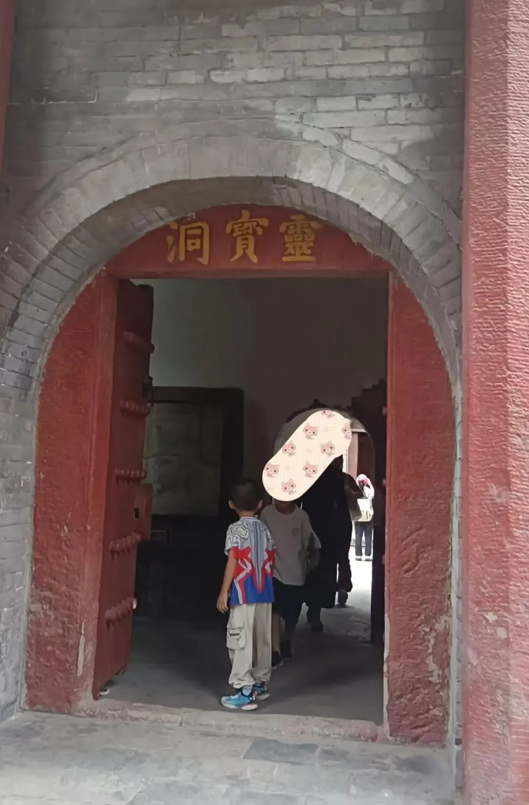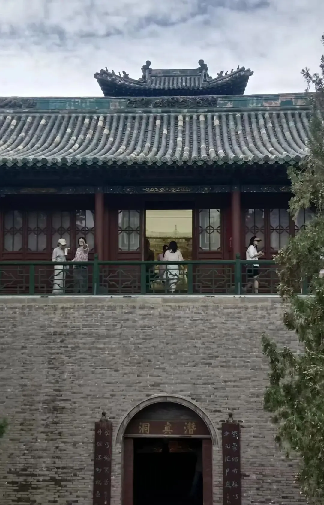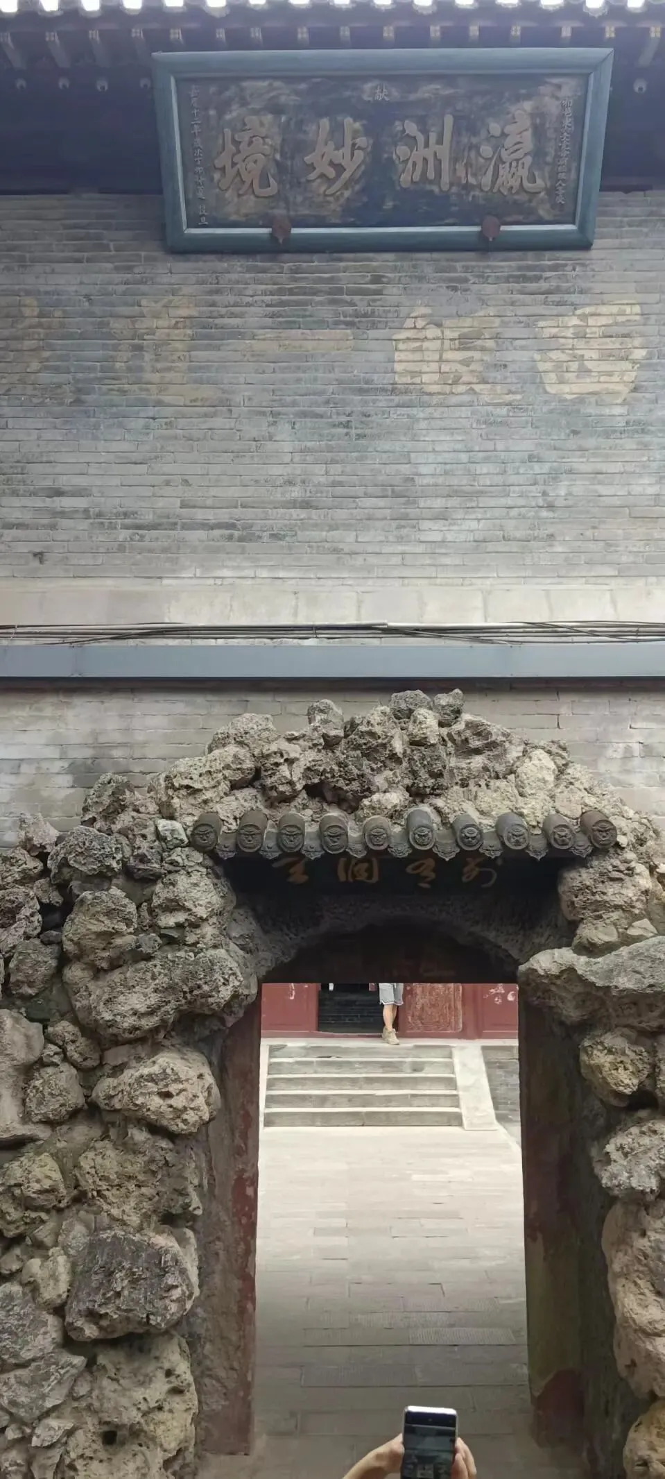 从拱形门进入,回看门上也有匾额,它是一块九叠篆匾额,字像画一样,好看,但一个也不认识,写得是“蓬壶佳瑞”,蓬壶:指道教传说中的海上仙山蓬莱与方壶(也叫方丈山);佳瑞,预示祥瑞之兆,暗含得道成仙的吉兆,四字合起来,意思就是此处为蓬莱仙境,祥瑞汇聚之地。