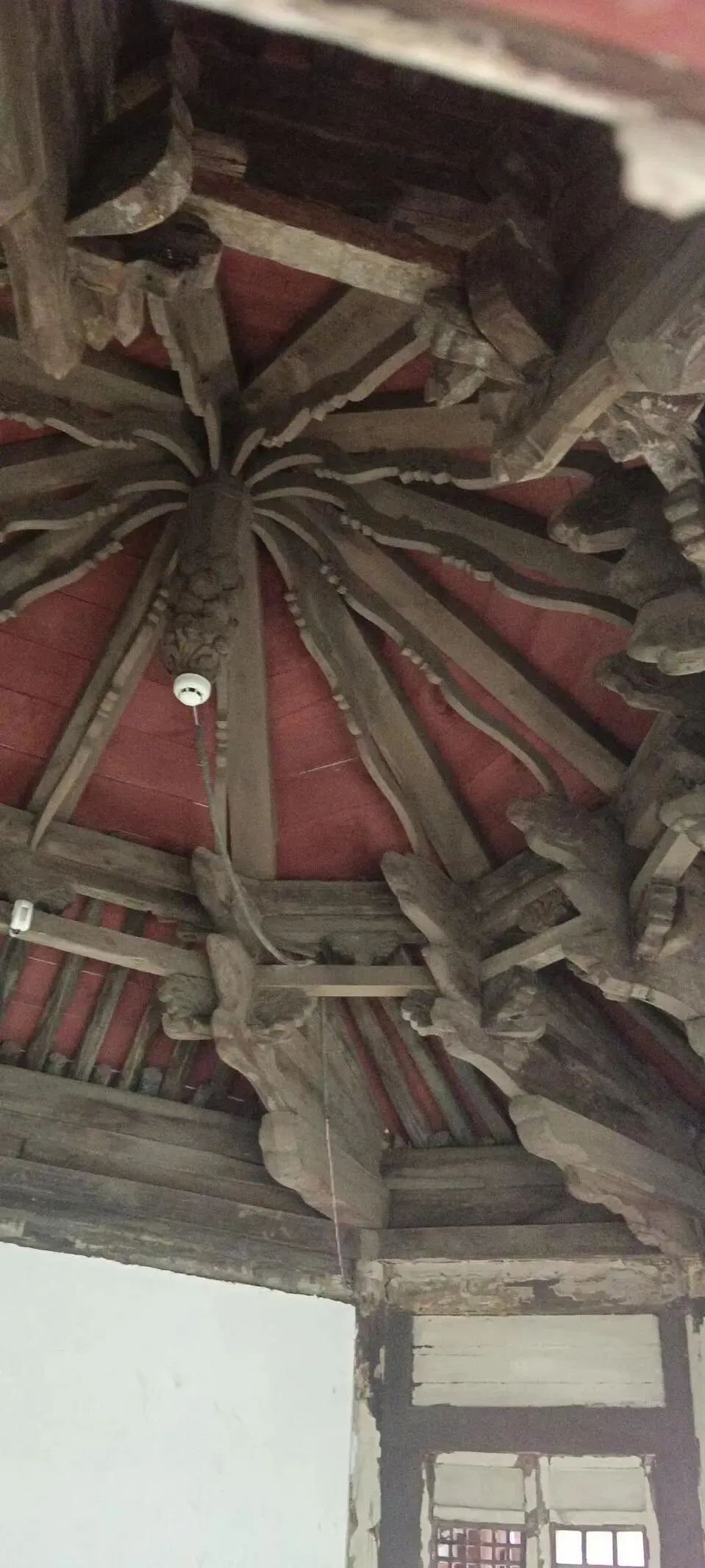 二层东南西北各有一个阁楼,阁楼屋顶是九角攒尖亭,通常所见大多是八角攒尖亭,这个顶是分两部分,一分部由2个角分180度,其余7个角分180度。