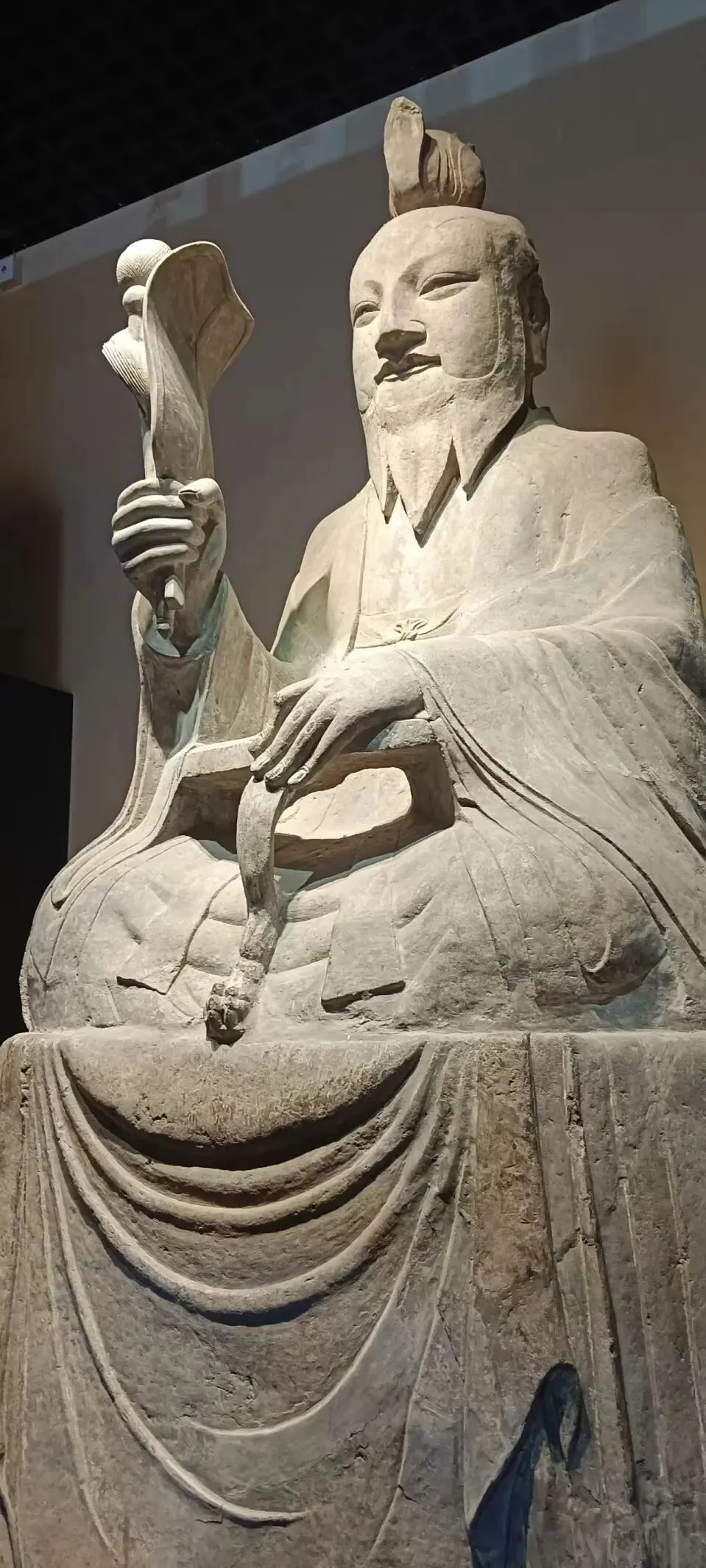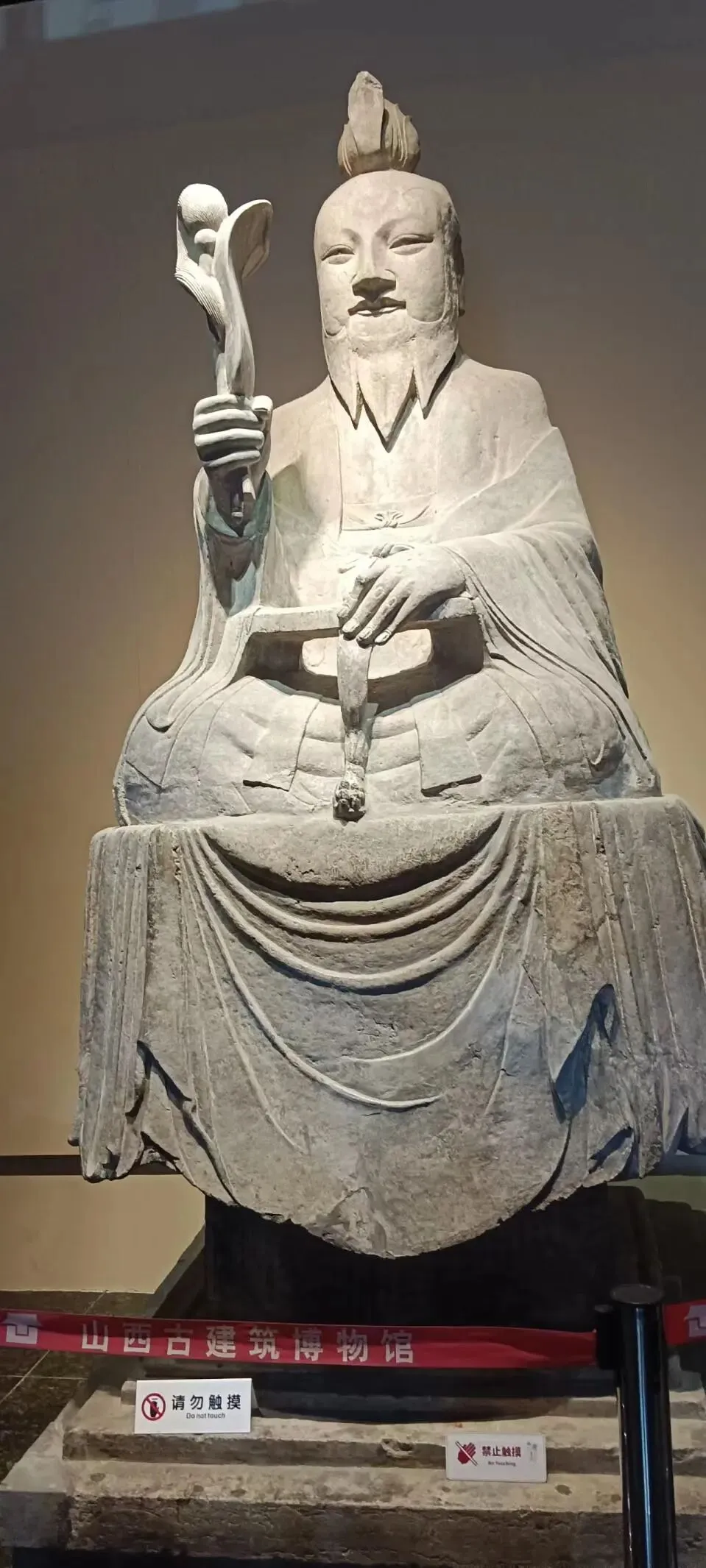 这是一尊唐代的道教天尊人物造像,,头戴莲花冠,颌下有须,面相丰满,双目细长,神态安详慈和,身着宽大道袍,左手放在三条腿的凭几上,出土时右手已经断掉了,是后来修复时加上的。