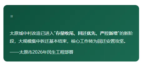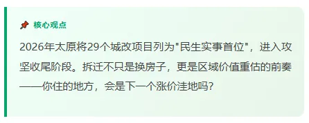2026年3月,太原市政府工作报告正式将"推进29个城中村安置、6处危旧房改造"列为民生实事之首——这是一个关键信号:太原城改进入了最后的攻坚阶段。
