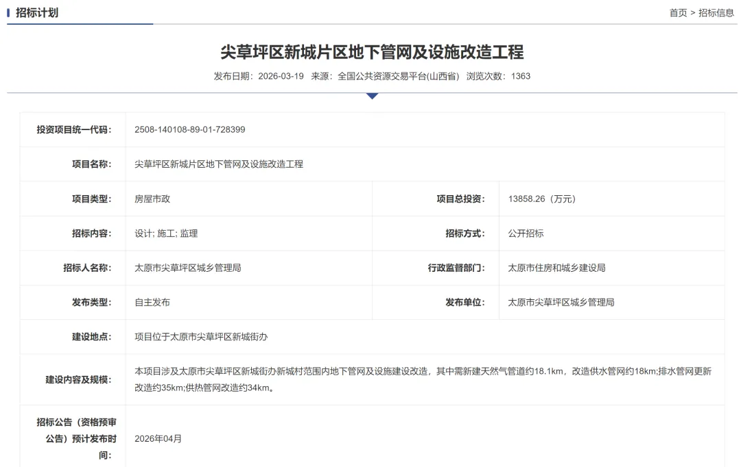 招标计划显示:尖草坪区新城片区地下管网及设施改造工程项目总投资13858.26万元,招标内容包含设计; 施工; 监理,项目位于太原市尖草坪区新城街办。
