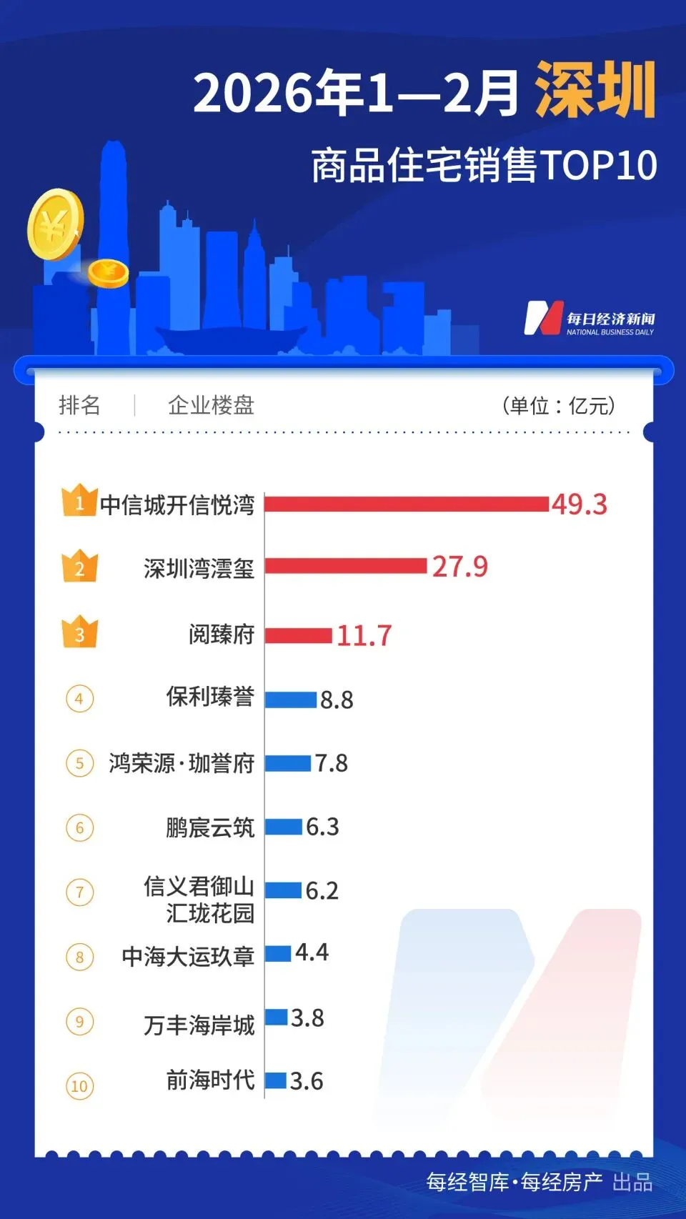中指研究院统计数据显示:2026年1~2月,在深圳,中信城开信悦湾、深圳湾沄玺、阅臻府三个项目分别实现销售额约49.3亿元、27.9亿元、11.7亿元,销售额超10亿元的项目数量达到3个。其中,中信城开信悦湾也是十大热点城市中的“销冠”。