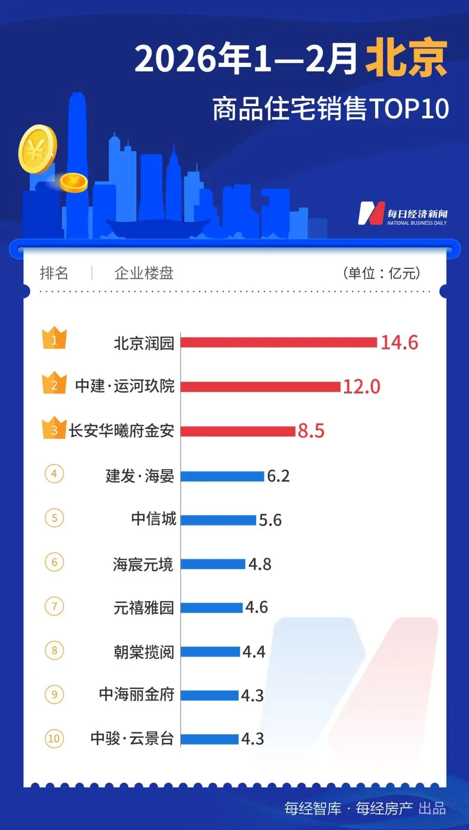 《每日经济新闻》记者梳理中指研究院统计数据发现,2026年1~2月,全国十大热点城市的新房销售TOP10项目(以下简称TOP10)榜单出炉。与2025年前两个月上海TOP10合计销售额“遥遥领先”不同,今年前两个月深圳TOP10合计销售额(约129.8亿元)反超上海,成为新的领跑者:上海TOP10、北京TOP10合计销售额分别位列第二(约105.5亿元)、第三(约69.4亿元);杭州TOP10合计销售额(约61.9亿元)则超过广州TOP10合计销售额(约50.5亿元)。
