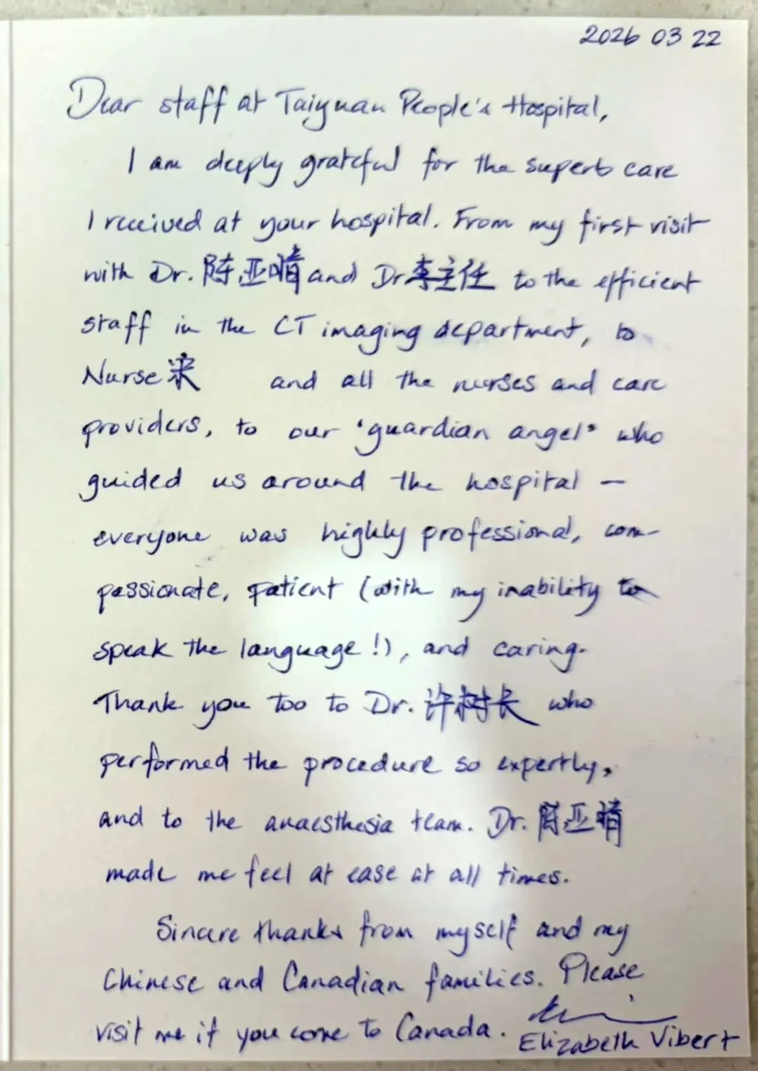 治疗结束后,Elizabeth Vibert教授特意写下了一封感谢信。她在信中特别提到了医院专家团队、老年医学科医护团队,以及影像科、麻醉团队、护理组等工作人员。她表示,从初次就诊时的细致问诊,到高效完成检查,再到护士的悉心照料,全程的引导与服务都让她印象深刻。即便语言不通,也从未感到不便。这份温暖,她和中国、加拿大的家人都记在心里。她还热情发出邀请:“欢迎大家来加拿大做客!”