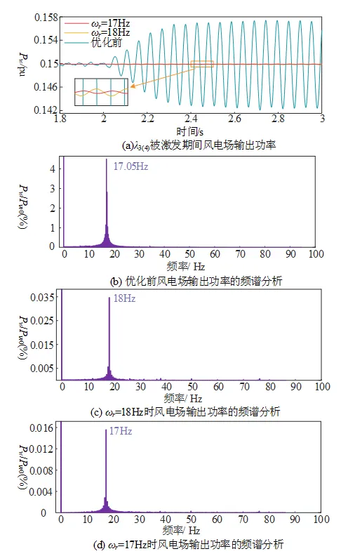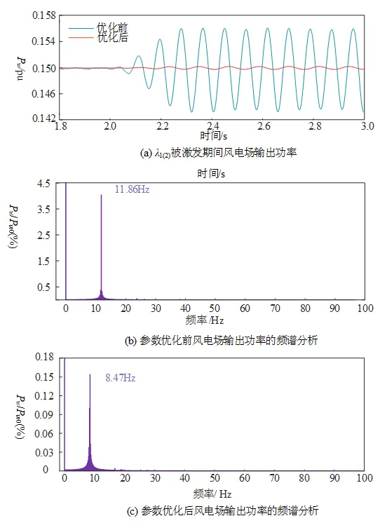 图2 参数优化前后λ3(4)引起的振荡功率波形及频谱分析