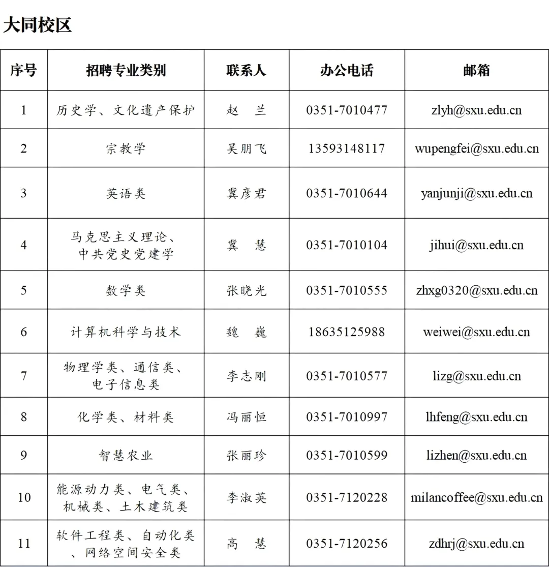 大同校区:宗教学、科学技术哲学、文化遗产、外国语言学及应用语言学、英语语言文学、马克思主义理论、中共党史党建学、数学、统计学、计算机科学与技术、物理学、通信与信息系统、信号与信息处理、高分子材料与工程、有机化学、材料物理与化学、材料学、物理化学、智慧农业、新能源科学与工程、储能科学与工程、网络空间安全、机械工程、电子信息、电气工程、智能科学与技术等相关学科专业。