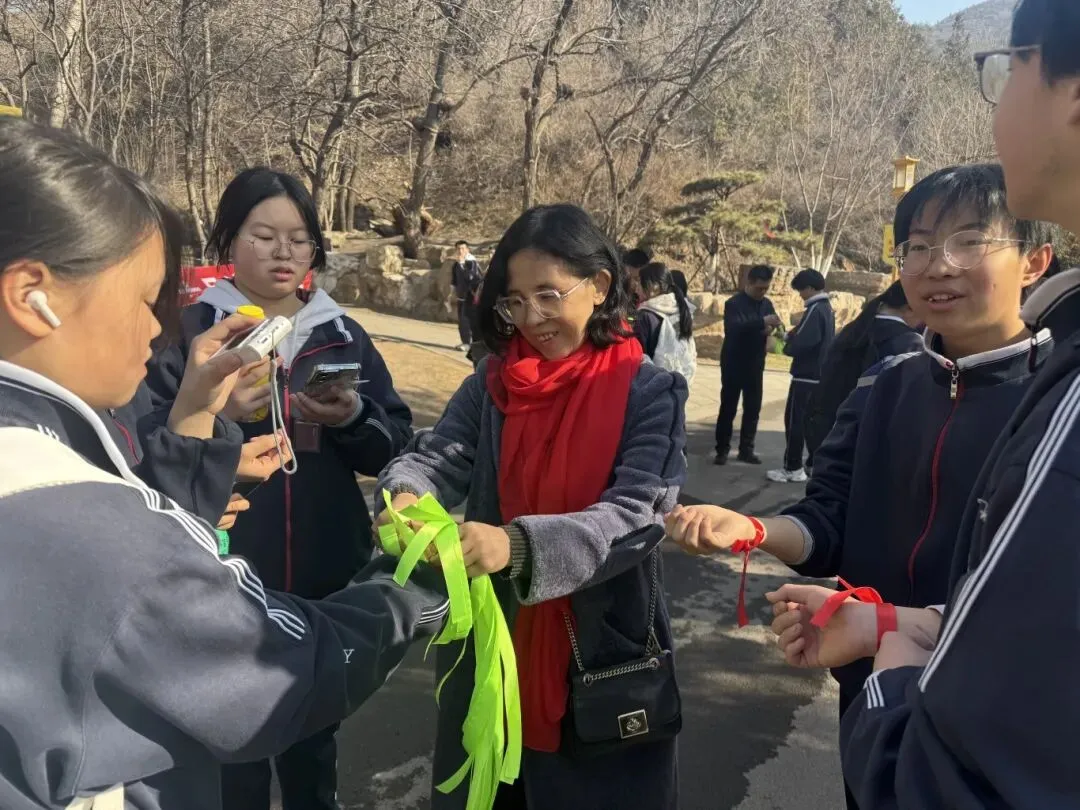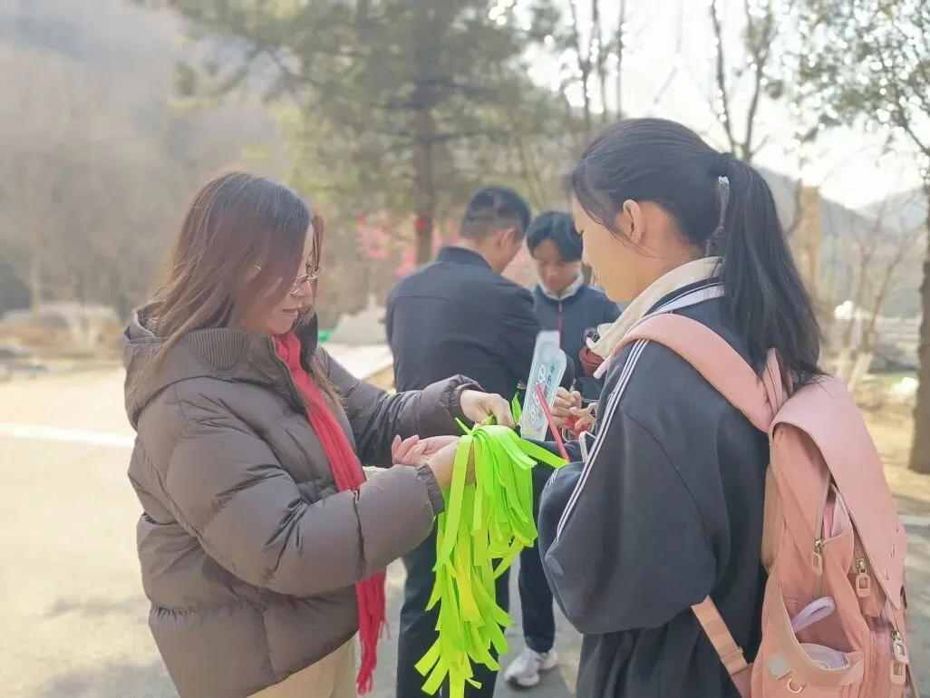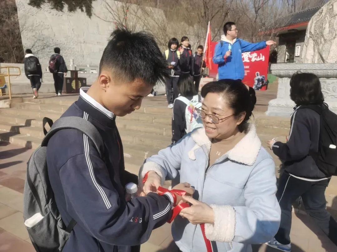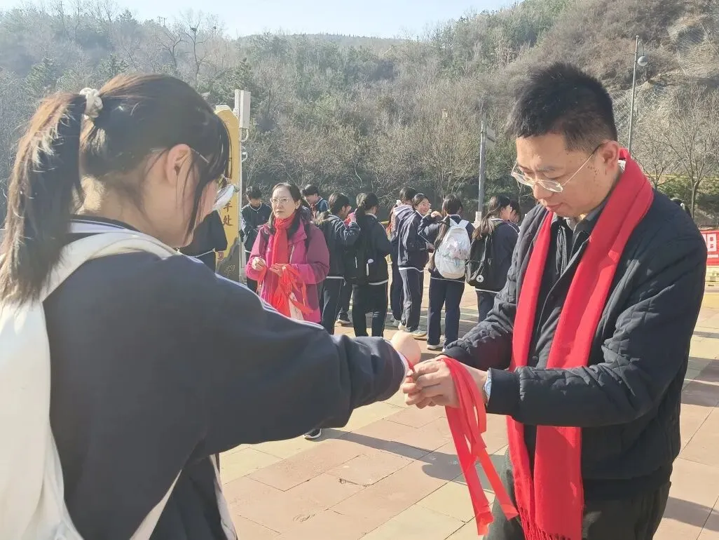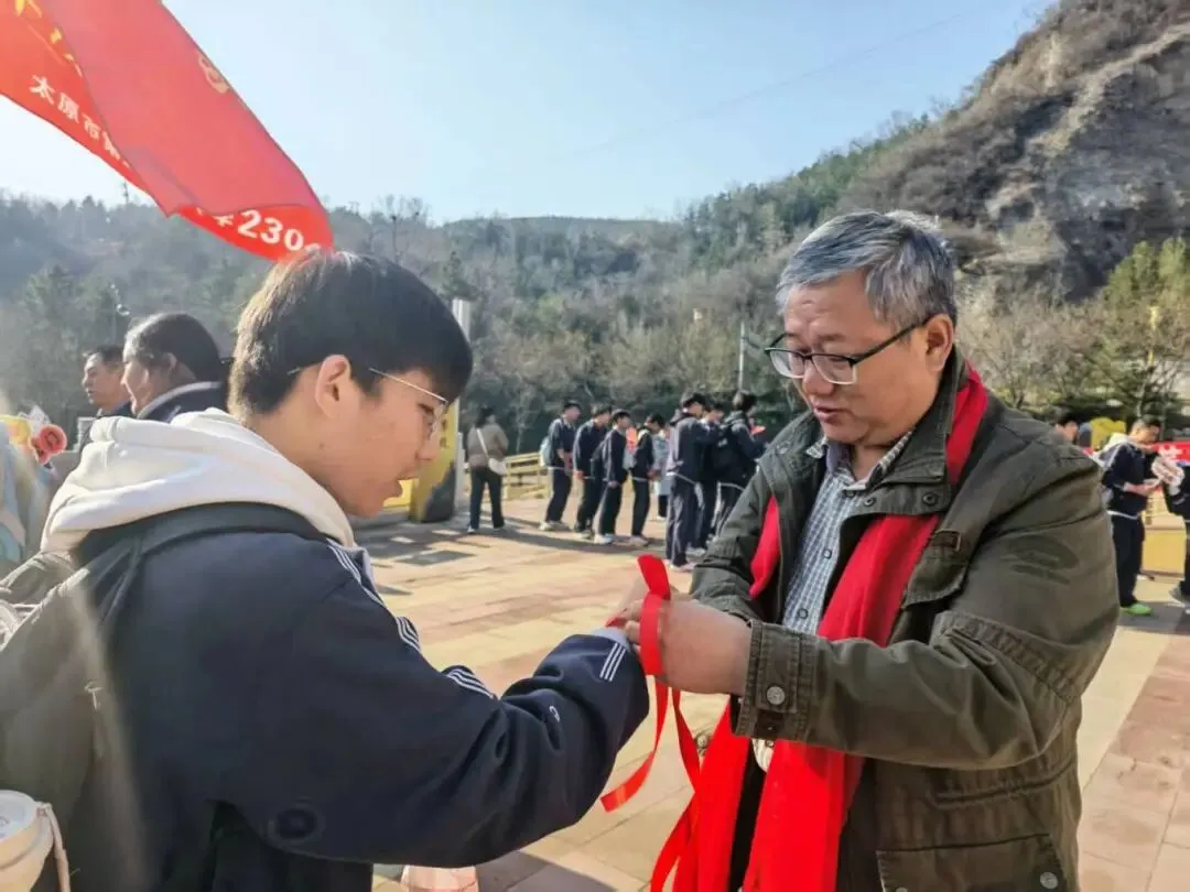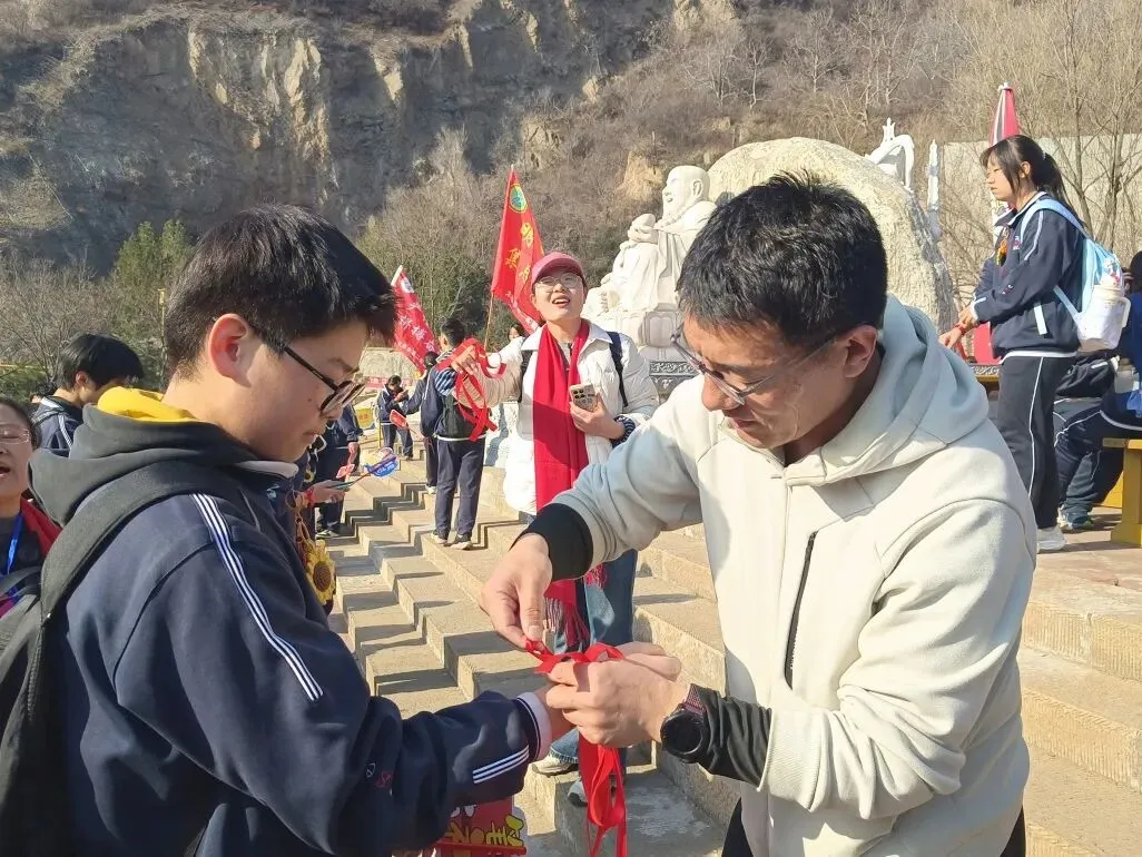 山路蜿蜒,挡不住少年前行的脚步,学子们用行动诠释着“不畏艰难、勇攀高峰”的拼搏精神。沿途驿站,老师们为学生系上象征好运的红、绿、紫丝带,预祝学子们中考大捷!