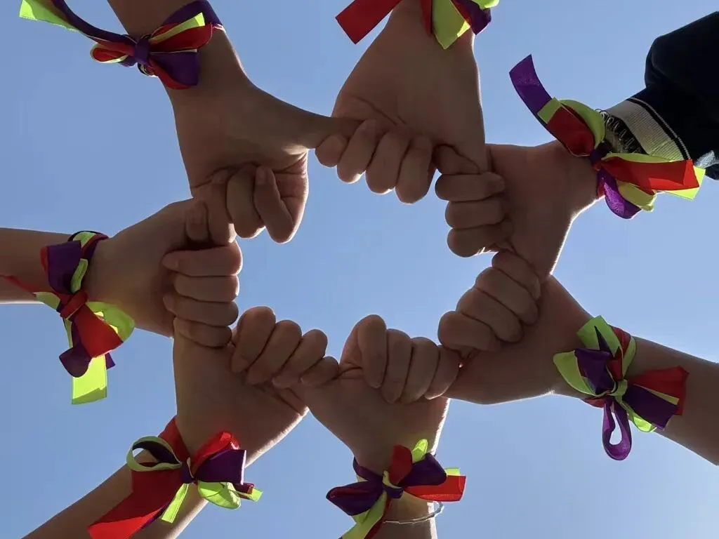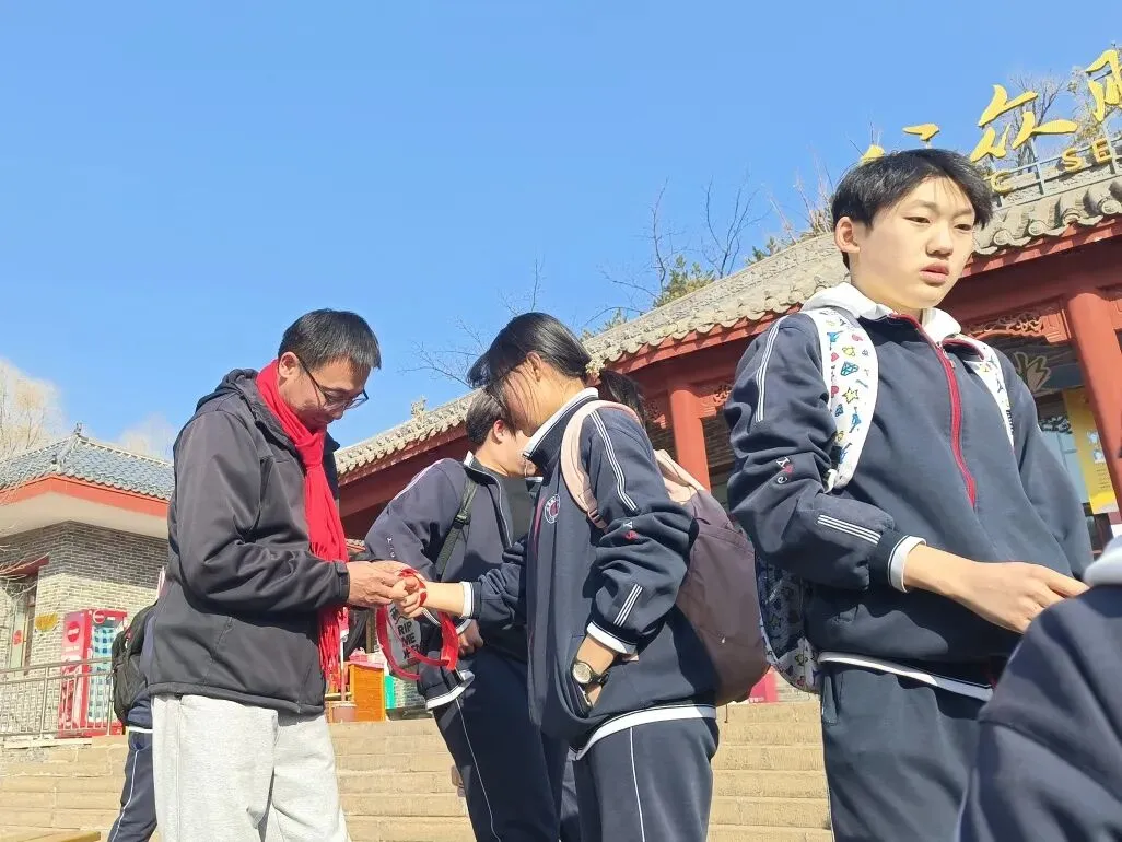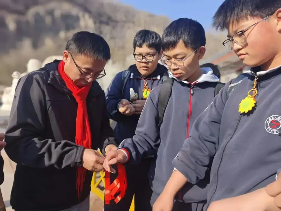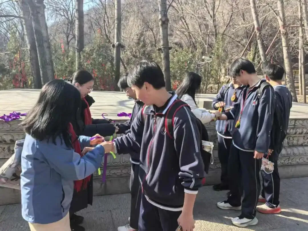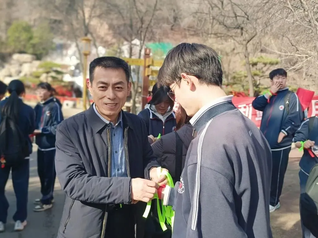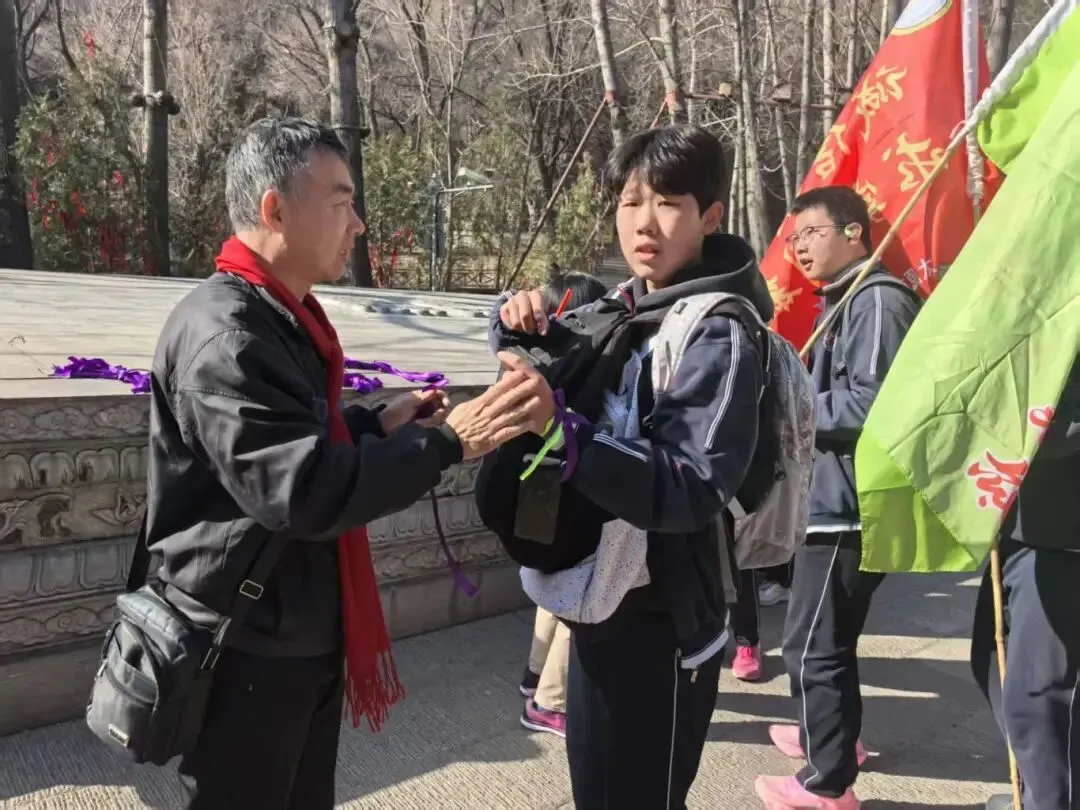山路蜿蜒,挡不住少年前行的脚步,学子们用行动诠释着“不畏艰难、勇攀高峰”的拼搏精神。沿途驿站,老师们为学生系上象征好运的红、绿、紫丝带,预祝学子们中考大捷!