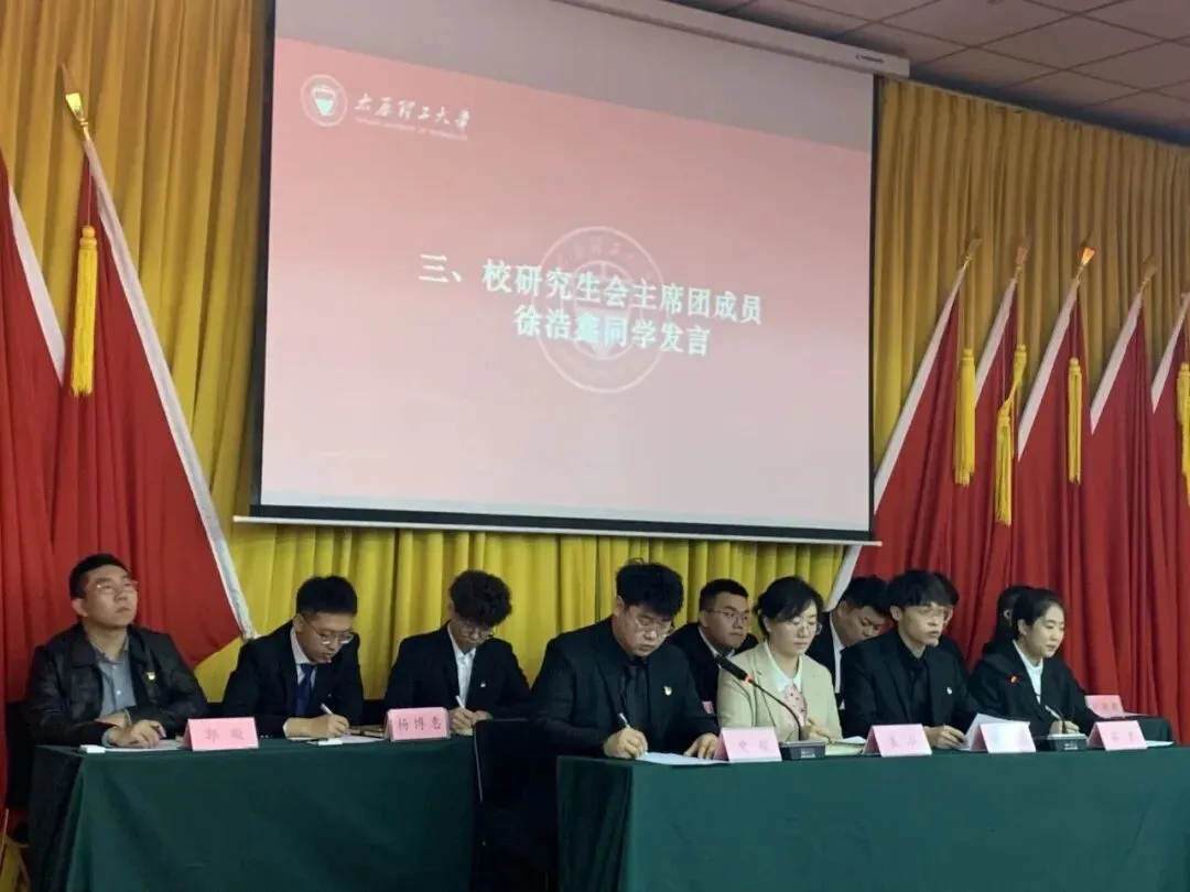 接着,太原理工大学研究生会主席团成员徐浩鑫受第四届太原理工大学研究生会主席团委托,向大会做报告。他指出,研究生会是在校党委坚强领导下,在校团委和研工部具体指导下,全心全意为全体研究生服务的群众性组织。基于共青团和学联对高校研究生会的指导意见及要求并结合校研会的具体实际情况,他对全体研究生会成员提出以下几点希望:一,政治过硬,思想先进。全体研究生会成员要站稳政治立场,把握政治方向,严守政治纪律,加强政治历练,夯实理论根基,通过不断的理论学习和政治历练,使自己的政治素养与担任的工作职责相匹配,同学校发展的要求相适应。二,精诚团结,建设组织。全体研究生会成员以及各二级学院研究生会要紧密团结在一起,打造一支围绕中心能干事、面对机遇干实事的工作队伍,向着更加团结、更高素质、更好作为的方向努力奋斗。第三,积极工作,担当使命。全体研究生会成员重任在肩,施展才干的舞台无比广阔,要珍惜来之不易的机会,积极投身学生工作,交出让学校满意,让学生舒心的研究生会答卷。最后,他从聚焦科学研究、丰富校园生活、维护学术权益、加强宣传推广几个方面对新一届的研究生会发展做出展望,并表示,在未来的时间里将矢志不渝、不忘初心,掣画属于研究生会的宏伟蓝图,为学校发展贡献属于自己的青春力量。