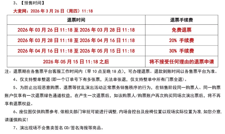 2.若演出受不可抗力影响延期或取消,大麦将对演出票订单按照项目官方通知方案进行处理,其他因观演发生的费用需由您自行承担。