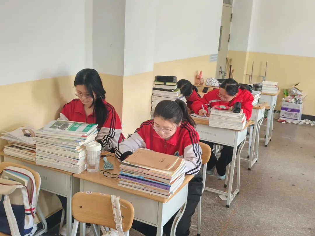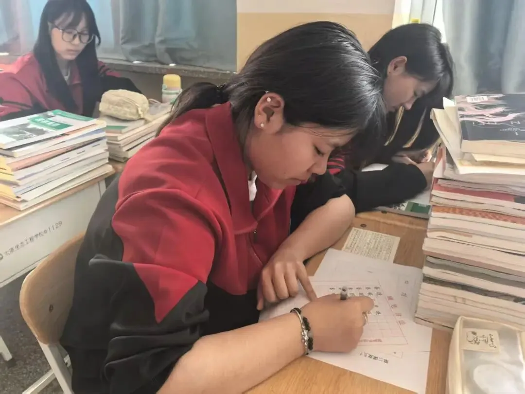 书法社的活动正在进行。3楼的同学们身着红黑校服,端坐于课桌前,笔尖轻触纸面,墨痕缓缓晕开。堆叠的书本化作临时屏障,将喧嚣隔绝在外,只余下沙沙的书写声。阳光透过窗纱,在纸页上投下暖光,将每个人认真的侧脸勾勒得格外清晰。大家在一笔一画间沉淀心性,感受着汉字的韵律与力量,让墨香在教室里静静流淌