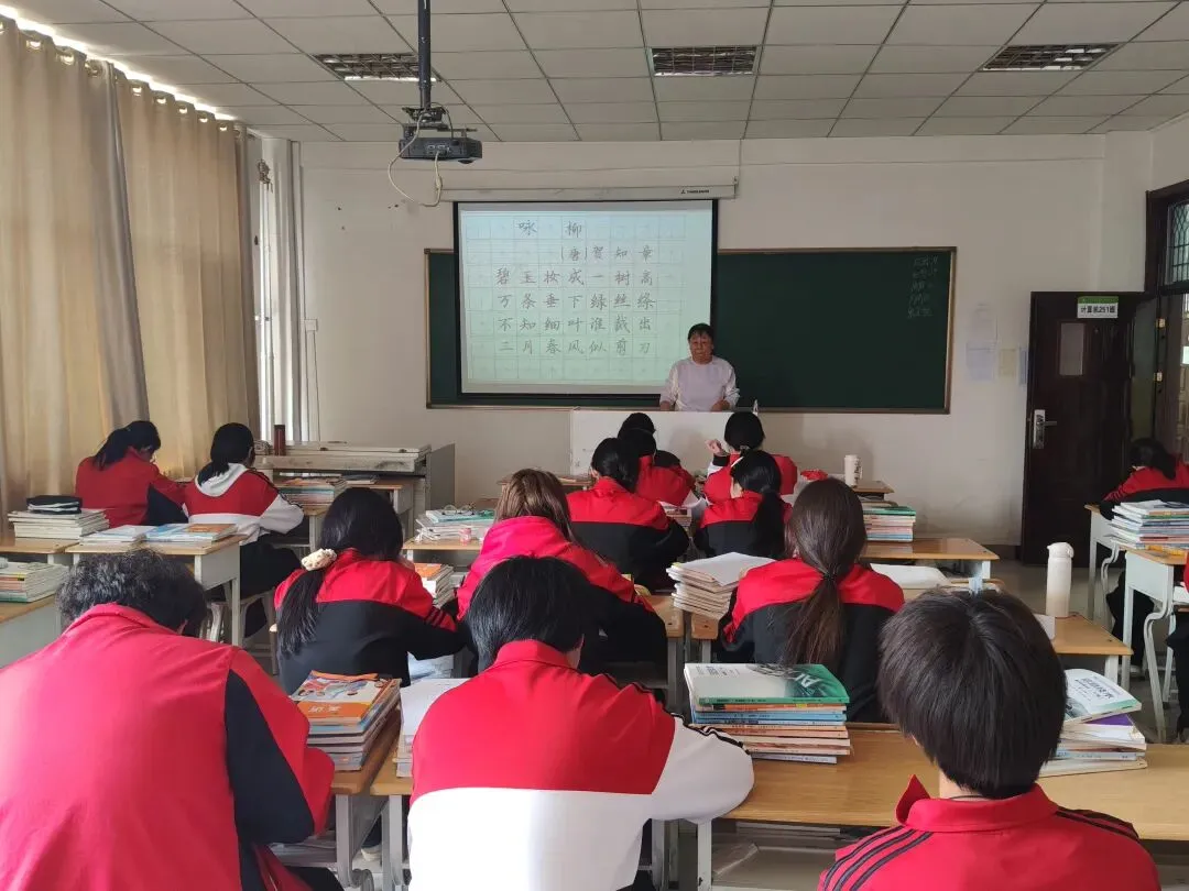 6楼书法社,老师站在讲台上,细致讲解古诗《咏柳》的书写技巧。投影幕布上范字清晰,她从笔画起收、间架结构逐一拆解示范。台下同学端坐凝神,或伏案描摹,或托腮思索,笔尖沙沙作响。阳光透过米黄色窗帘洒入,墨香与书香交融,在方寸之间演绎着汉字的风骨与诗意。