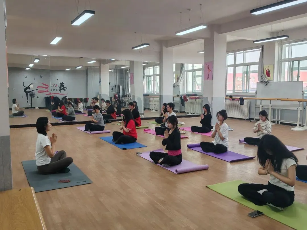 明亮的舞蹈教室里,瑜伽社的活动正温柔展开。彩色瑜伽垫整齐铺在木质地板上,同学们身着舒适衣物,盘腿而坐,双手合十于胸前,跟随老师的指引调整呼吸。镜面墙映出大家沉静的身影,与墙上的舞蹈装饰相映成趣。阳光透过玻璃窗洒入,给每个人的侧脸镀上暖光,教室里只有均匀的呼吸声与轻柔的引导语。大家在一呼一吸间舒展肩颈、放松腰背,让身体与内心慢慢归于平和,在忙碌的校园生活里寻得一方宁静天地。
