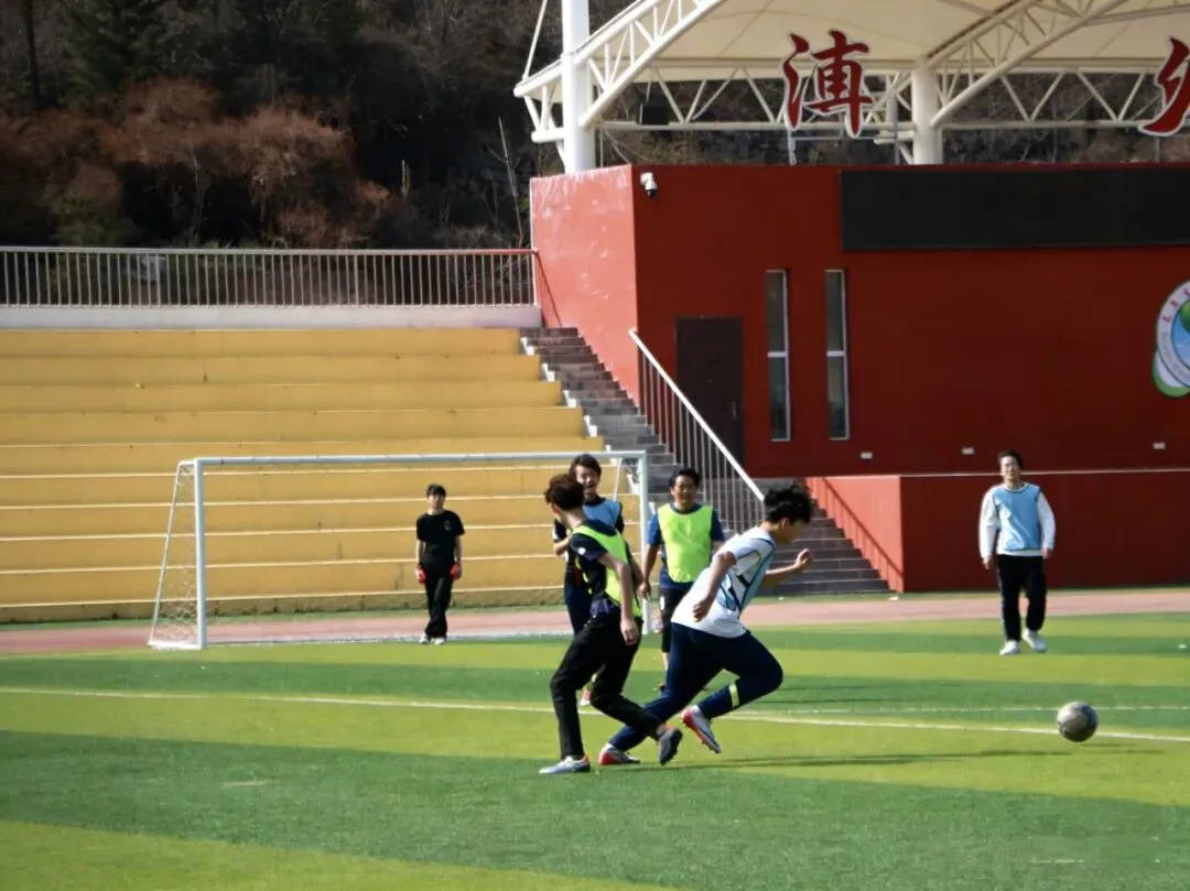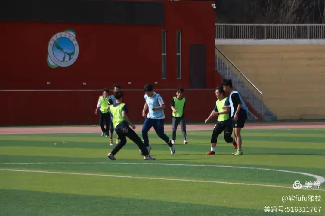 足球场上,同学们在老师的带领下开展攻防训练,学生们在奔跑中互相协作,提升他们在场上的竞技技巧,摔倒了他们互相扶持,在不断的坚持中感受体育的竞技以及他们心中的热血与激情。