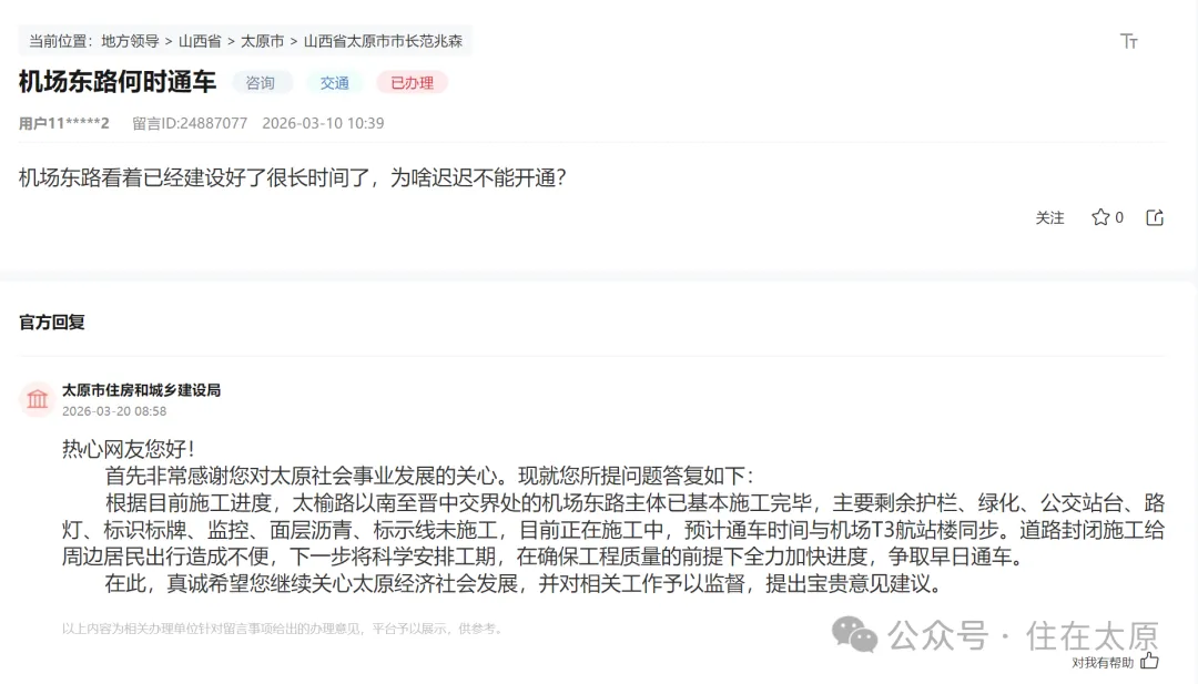 官方回复称:根据目前施工进度,太榆路以南至晋中交界处的机场东路主体已基本施工完毕,主要剩余护栏、绿化、公交站台、路灯、标识标牌、监控、面层沥青、标示线未施工,目前正在施工中,预计通车时间与机场T3航站楼同步。道路封闭施工给周边居民出行造成不便,下一步将科学安排工期,在确保工程质量的前提下全力加快进度,争取早日通车。