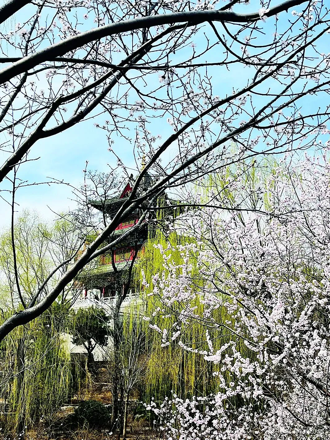 园内,柳树垂下万千绿色丝绦,嫩枝泛着新绿,在风里轻轻摇曳;湖水清澈透亮,微波荡漾,轻轻拍打着堤岸。湖水中鹅鸭嬉戏,鱼儿穿梭追逐,一条条红色鱼线时隐时现。石桥边、古建旁,不时有穿汉服的少女驻足拍照;亭子里歌声阵阵,乐声悠扬,吉他、口琴、琵琶、二胡、笛子交织在一起,人群聚集,如春花般一簇簇盛开。
