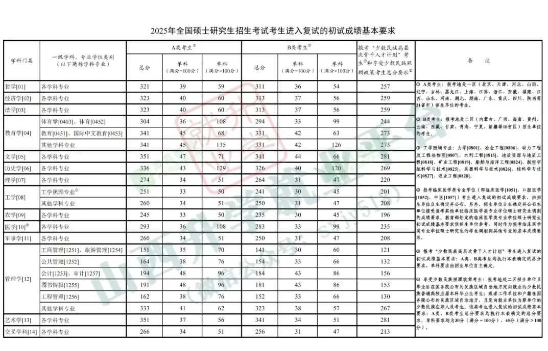 二、报考“退役大学生士兵计划”复试分数线:总分及单科不低于教育部划定的“2026年全国硕士研究生招生考试考生进入复试的初试成绩基本要求(A类考生)”相应学科专业的要求。