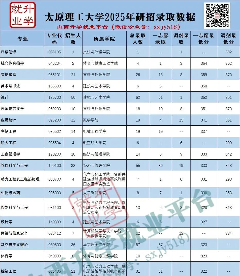 有关需接收调剂的专业、调剂分数线及要求、调剂工作程序、调剂具体时间等内容将在一志愿复试录取工作结束后,在太原理工大学研究生院网站和有关学院网站发布通知公告。