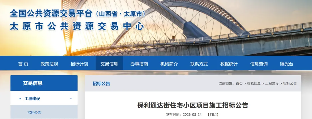 3月24日,太原市公共资源交易中心消息,山西省太原市小店区保利通达街住宅小区项目施工开始招标。工程投资额约18268万元。《保利通达街住宅小区项目施工招标公告》显示,本招标项目已由太原市小店区行政审批服务管理局批准,项目资金来源为自有资金,招标人为太原保通房地产开发有限公司。本项目已具备招标条件,现进行公开招标。