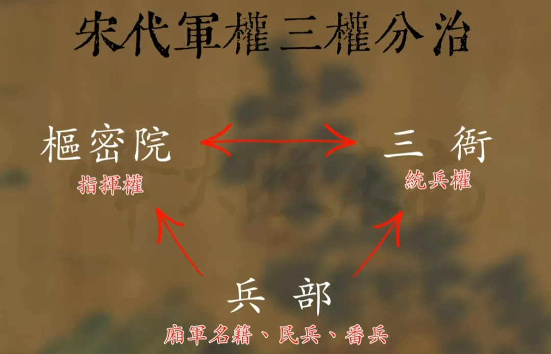🔒 【核心问题】二者互相牵制约束。枢密院尽管有调兵发兵的权限,但实际上这中间必须要经过皇帝批准。皇帝自始至终都掌握着最高军权.