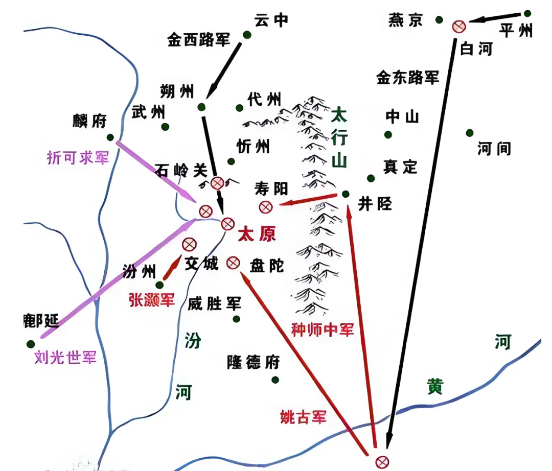 剩下两员将领:姚古负责河东,种师中负责河北。姚古没能成功解救太原,皇帝不得不命令种师中兵出井陉,进入河东和姚古形成钳形攻势,夹攻太原外的金军。